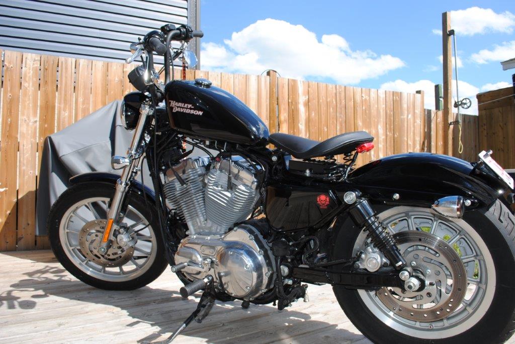 A 2008 Harley Davidson XL883. A bare-bones, black, solo seat, completely stock bike (With a new set of very loud pipes).