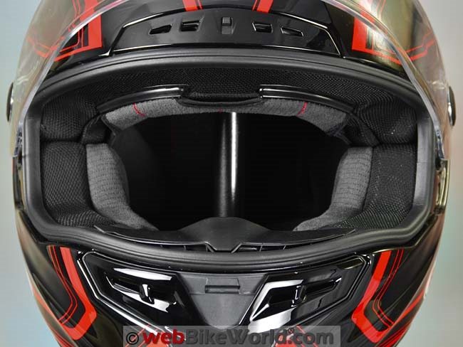 The shape of the helmet at the chin bar is narrow also, so the bottom front corner of the cheek pads form a point that can cause interference as you pull on the helmet. You can see this in one of our photos below.