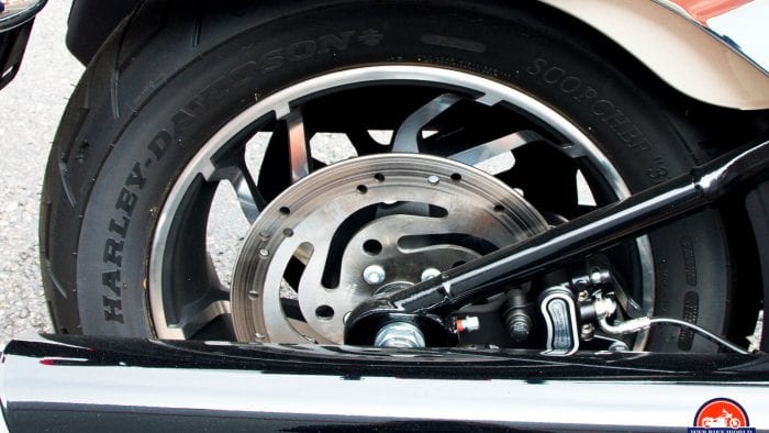 The Michelin Scorcher tires even have small depressions around the edges of the rubber that are shaped like the Harley logo. Small badging and tasteful, low key branding on the side of the gas tank among other locations on the engine and saddlebags is all done just right.
