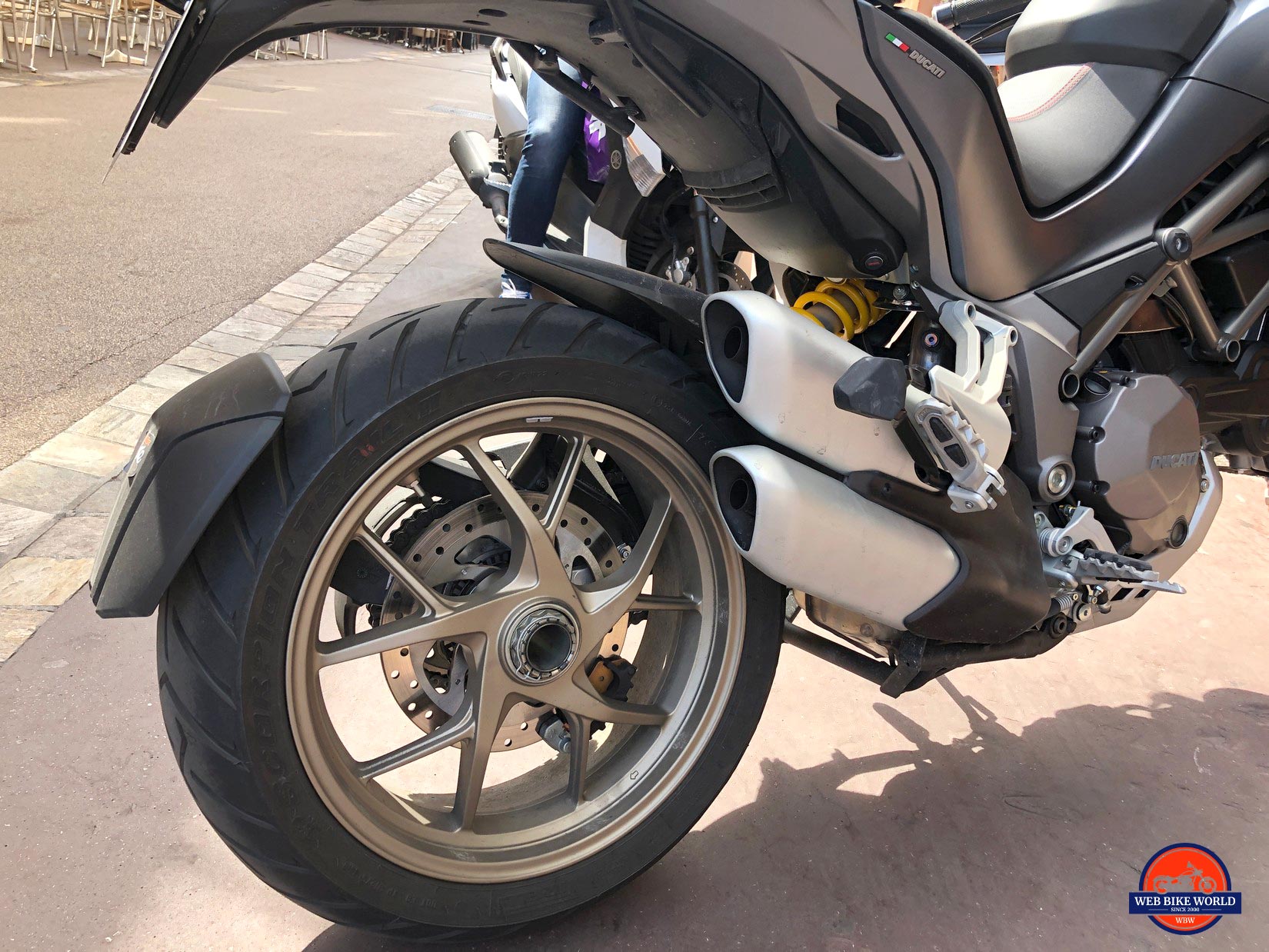 I scared the wits out of my wife on one very aggressive launch coming out of a sharp turn onto a long straightaway! It’s fortunate to have the DWC (Ducati Wheelie Control) on this bike otherwise I doubt the front tire would ever wear out on it.