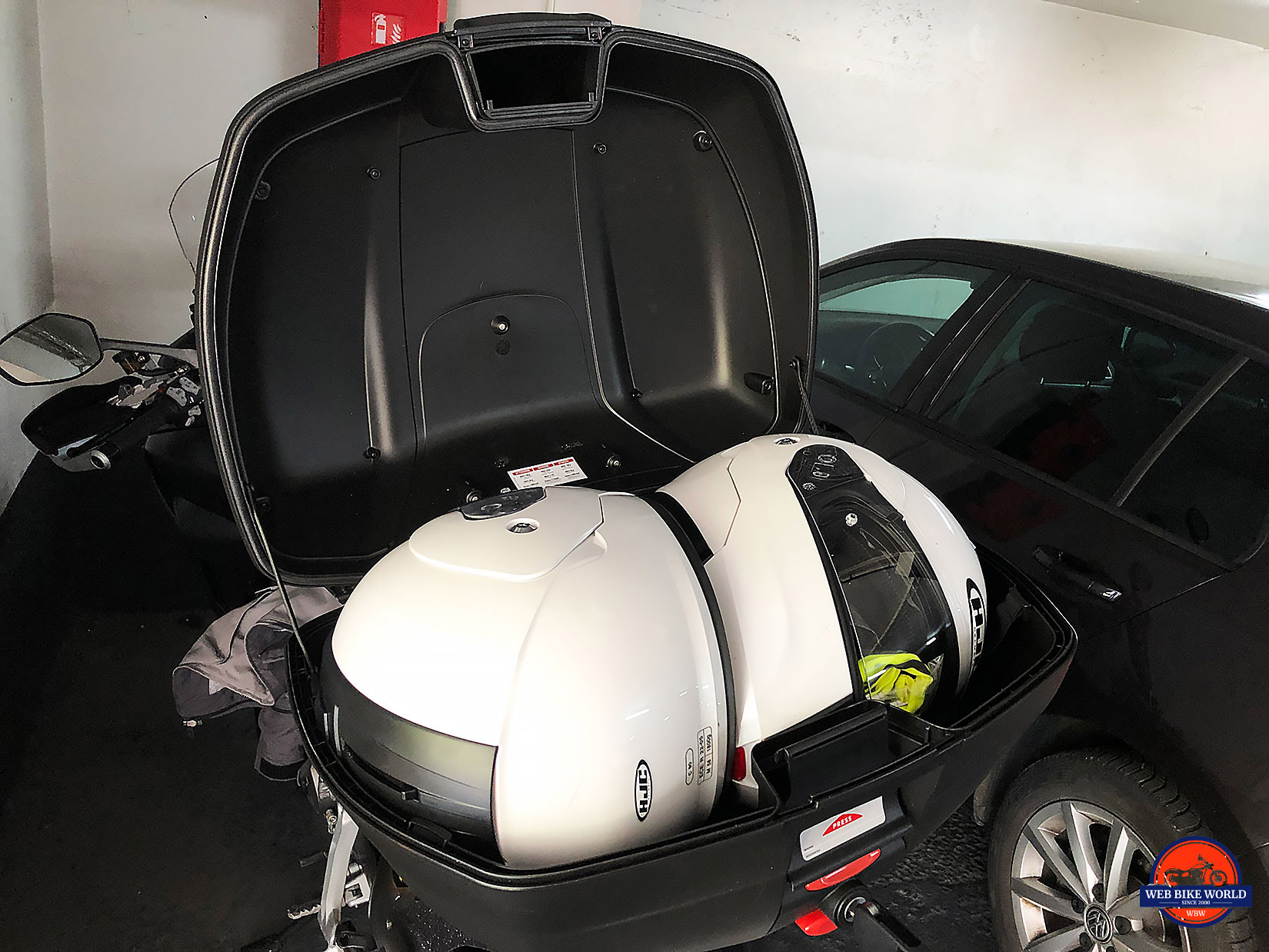 The bike I test rode didn’t feel top heavy even with the pack filled with heavy items and swallowed gear beautifully. It can hold two full face helmets with room to spare for gloves, locking devices, insurance paperwork… you get the idea.