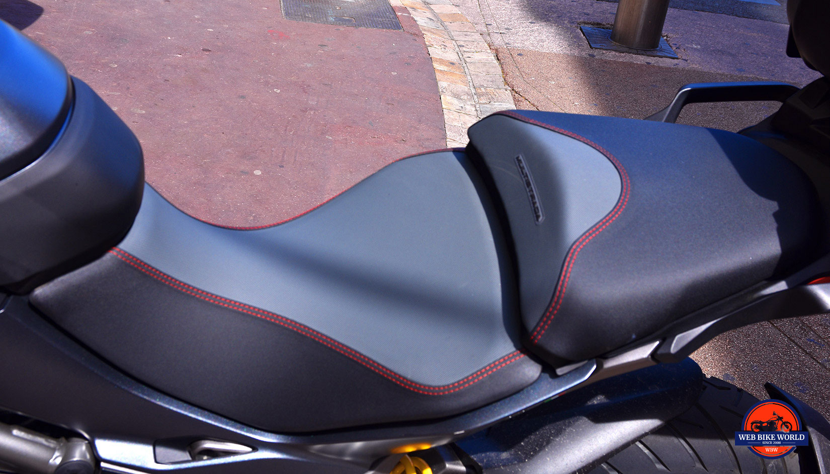This seat is covered in a grippy, textured yet slightly rubbery feeling leather with handsome red stitching in the seams. It’s surprisingly comfortable even after hours of riding for driver and passenger especially when combined with the factory Ducati tour pack which has a backrest pad for the passenger on it.