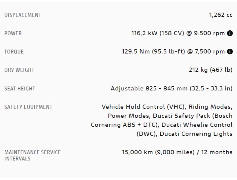 - Safety equipment: Vehicle Hold Control (VHC), Riding Modes, Power Modes, Ducati Safety Pack (Bosch Cornering ABS + DTC), Ducati Wheelie Control (DWC), Ducati Cornering Lights