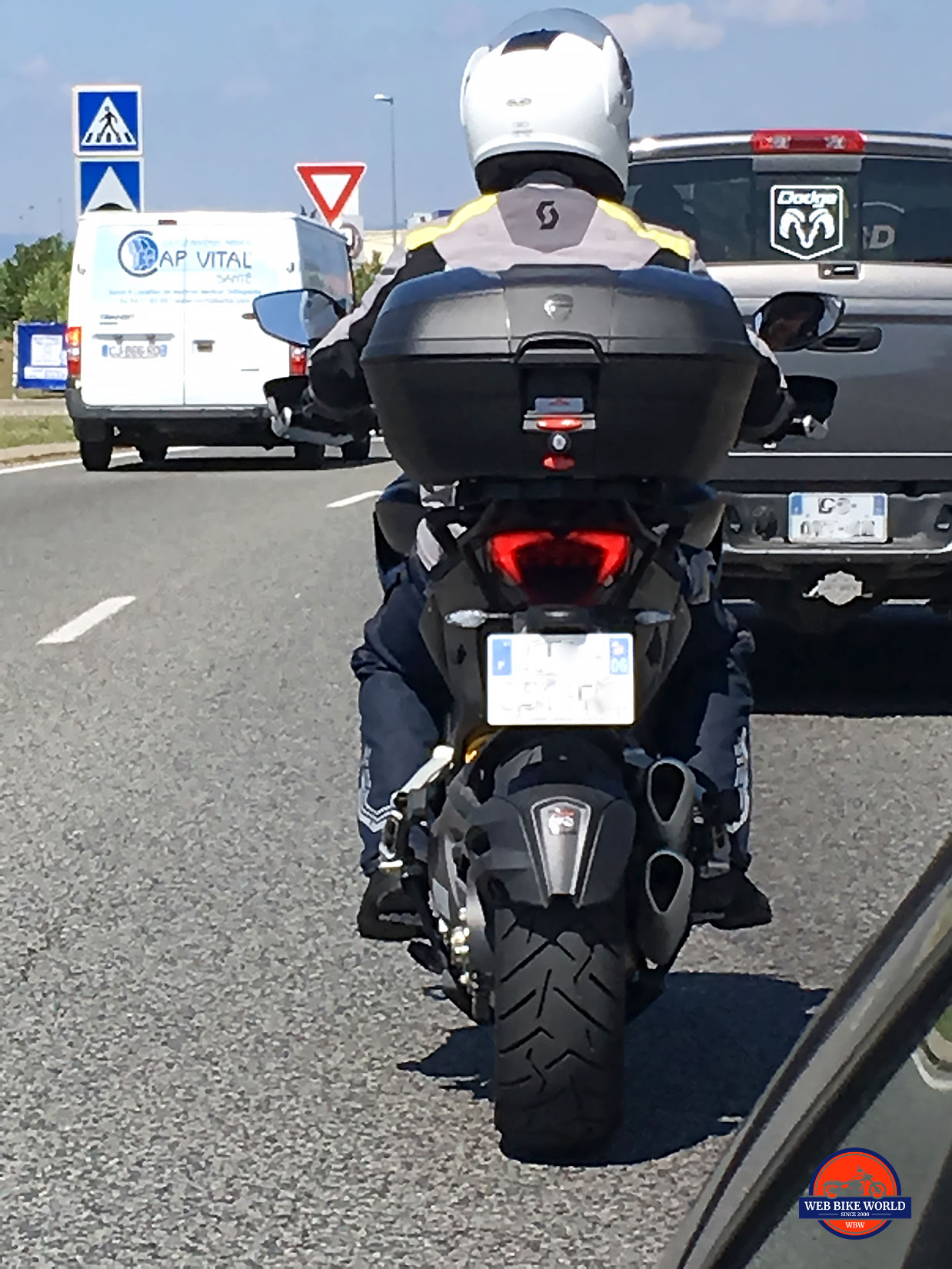 I found myself at one point having to push it backward over 60 feet while seated on it and was awed by how easy it was done. I accidentally rode into the wrong lane on the A8 toll road and couldn’t proceed because I didn’t have a passcard for the reader to scan. I’m sure onlookers thought it was pretty funny watching me “duck-walk” the bike out of there.