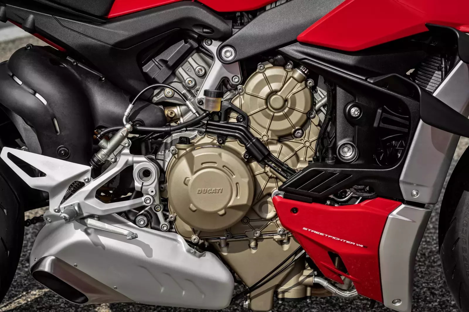 It also has the same engine configuration: 90° V4, rotated rearward by 42°. This solution makes the engine extremely compact, allowing centralization of mass and flawless integration with the vehicle.