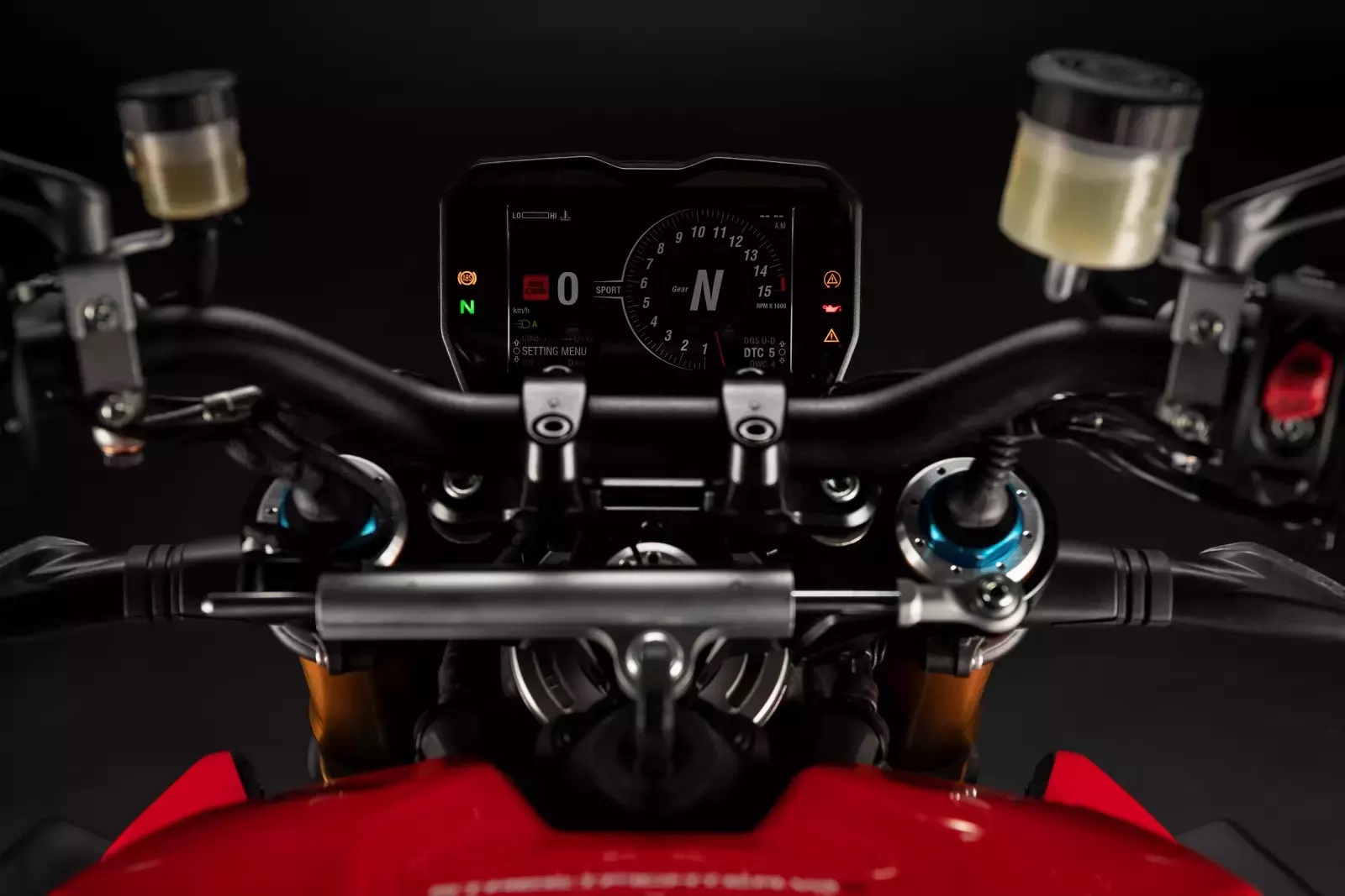 The headlight is surmounted by a 5″ TFT screen (the same as the one on the Panigale V4) and features a smartly styled front cover that hides connectors and wiring.