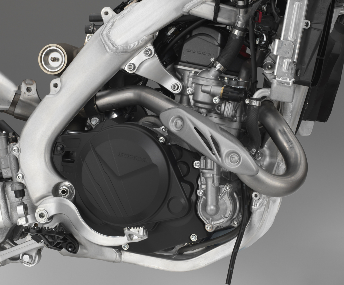 The CRF450X gets a special crankshaft, different from our CRF450R MX bikes and our CRF450L dual-sport. Why? The crank’s weight and inertial character make a huge difference in how a bike delivers power. A crank is expensive, but it’s no place to scrimp and try to save—with the CRF450X, power delivery is just what you want.