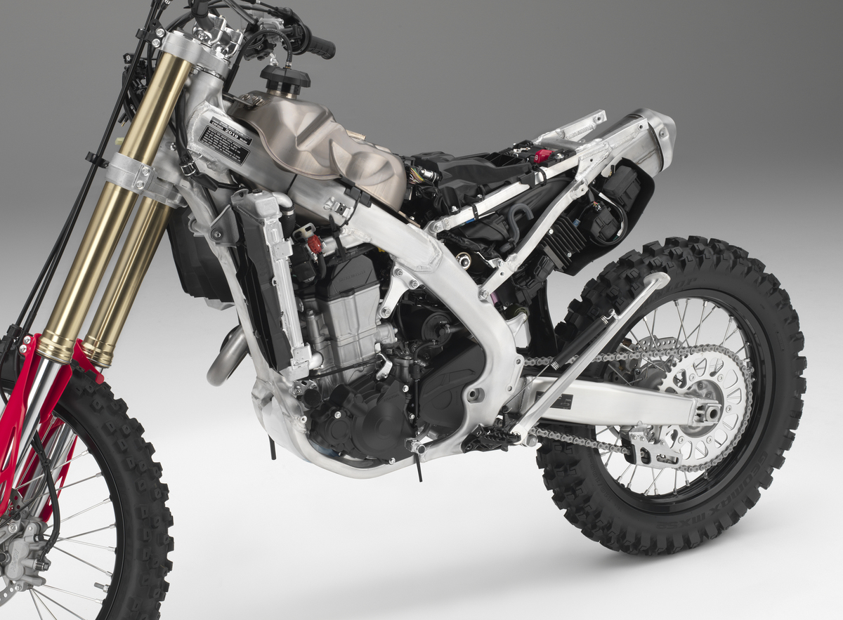The compact Unicam engine and Honda’s famous concentration on center-of-mass engineering help keep the CRF450X’s center of gravity low. That means the bike feels lighter, and it helps handling too.