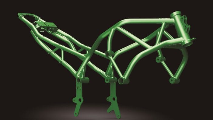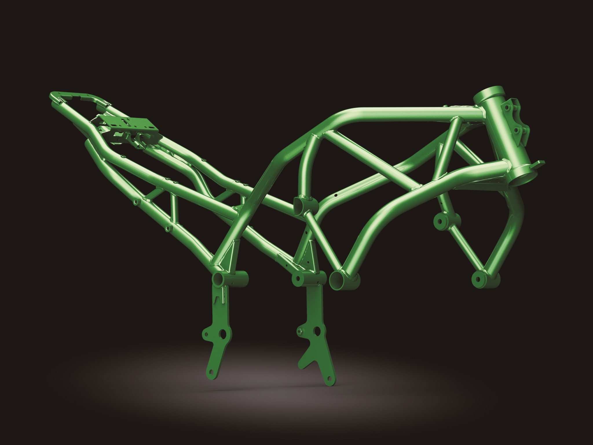 A lightweight trellis frame harnesses the massive engine power to help deliver lightweight cornering and straight-line stability.