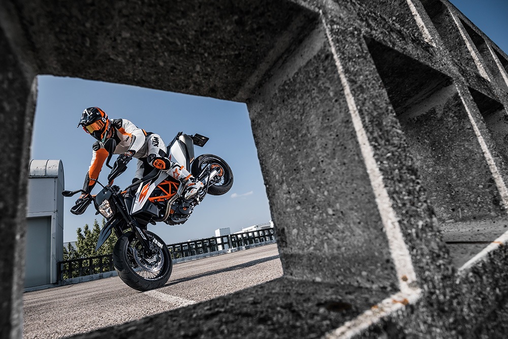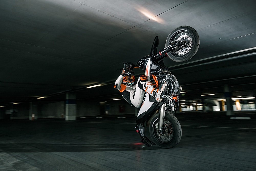 Drawing on its enduro-inspired roots, the 690 SMC R is powered by a strong LC4 690cc single-cylinder engine that’s loaded with power. The engine produces a total of 74 horsepower, 54 lb-ft of peak torque, and propels the 690 SMC R to a top speed of 124 mph. It’s big in power but compact in size, making for a potent combination. It has a great fuel economy and low running costs too.