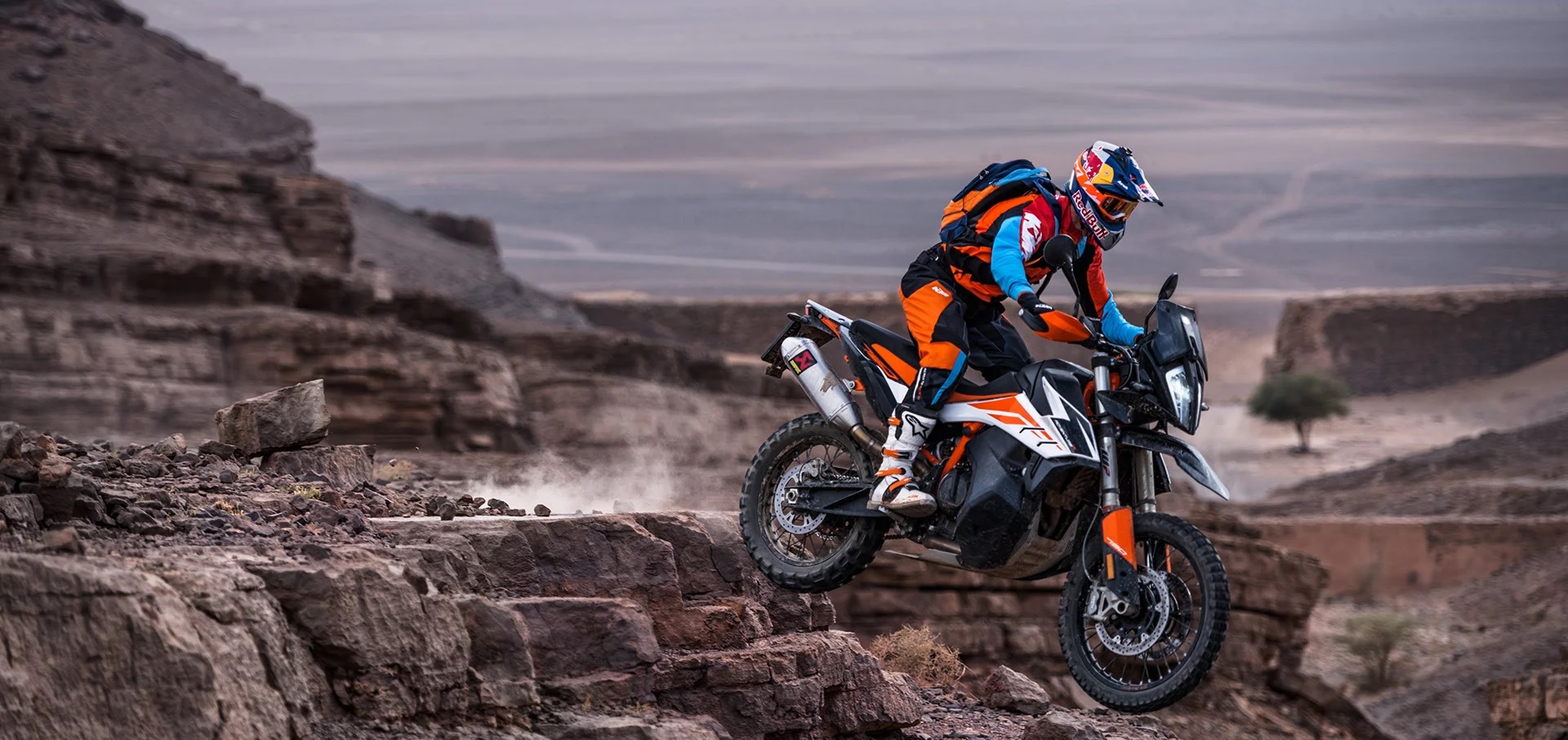 “Offroad ride mode” takes the sophisticated parallel-twin power of the KTM 790 ADVENTURE R and uses sophisticated sensors to adapt the power delivery through the ECU for effective and confidence-inspiring offroad use. Peak horsepower is reduced slightly, the throttle response is smoothened out and the amount of wheel slip allowed before electronic intervention is raised to allow for a more dynamic ride on loose surfaces. On such low-grip surfaces, a certain amount of wheel slip is needed to ensure forward motion. This feature allows riders to break traction to a fair degree and to facilitate rear-wheel steering. Anti-wheelie is not used in this mode, so riders can easily lift the front wheel over obstacles. Unlike some other modes, “Offroad ride mode” is not lean-angle sensitive, meaning that traction control does not intervene when a rider uses a berm, sand dune or rut to lean into a turn.
