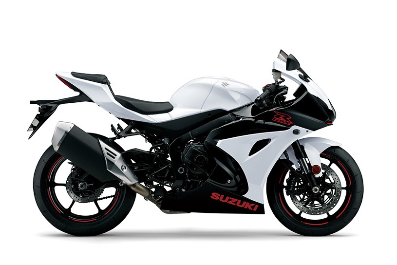The GSX-R1000 is available in a Glass Sparkle Black/Metallic Matte Black or a Pearl Glacier White/Glass Sparkle Black color scheme. Each version features complementary graphics and wheel trim.
