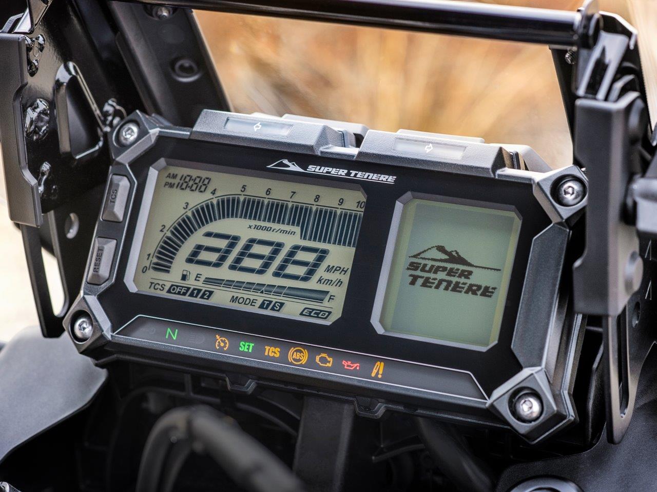 The Super Tenere ES comes standard with both a side kickstand and a center body stand for quick repairs in the middle of nowhere, as well as variable mode traction control, dual-zone ABS with an option to set unified braking (the front brake lever will also activate the rear brake at an electronically controlled rate), and throttle-by-wire using Yamaha Chip Controlled Throttle (YCC-T).