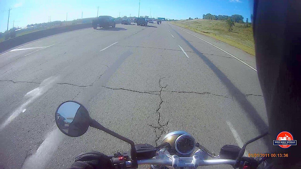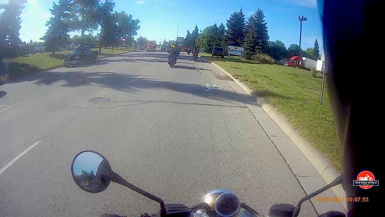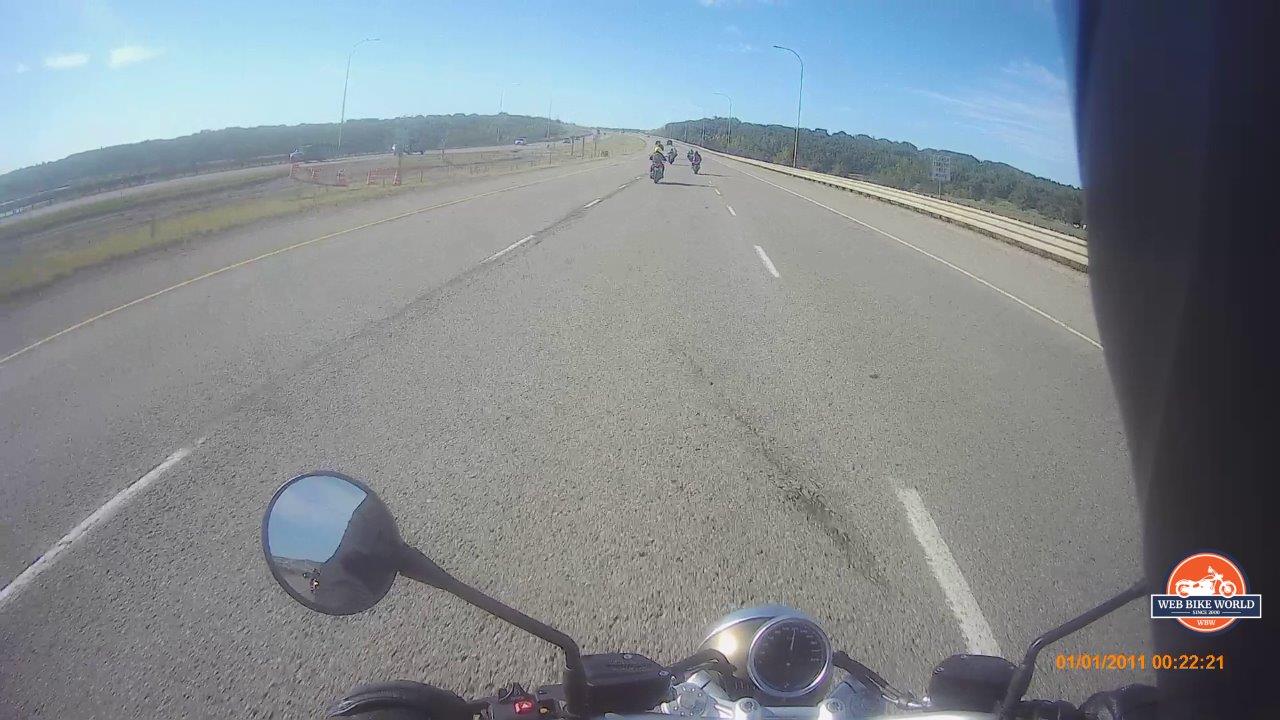 The group was fortunate to catch a red light just before that onramp. Because I wanted to get a good feel of what the R NineT Scrambler would do when given a sudden request for power, I left a good gap between the S1000R in front of me (which has an awesome exhaust sound from the factory!) and then, as we merged onto Deerfoot Trail, gave it some stick.