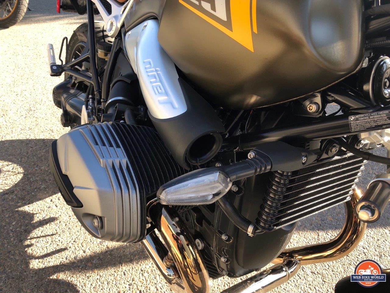 What the BMW Motorrad Canada representative dubbed the “Big-Ass Snorkel” sits tight to the right side of the frame, slung just so under the fuel tank. One of the neat things about the design of the intake is that as it’s intaking fresh air, it passes under the right leg, with the big “nineT” plate holding your knee and leg just enough away from the bike to not touch the intake header heading to the right cylinder. Just another one of those details that shows that BMW was paying attention in the design studio.