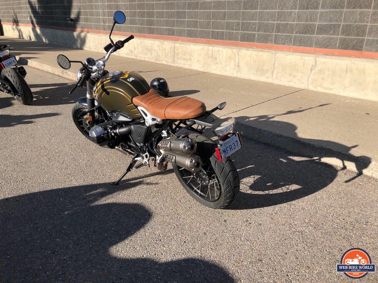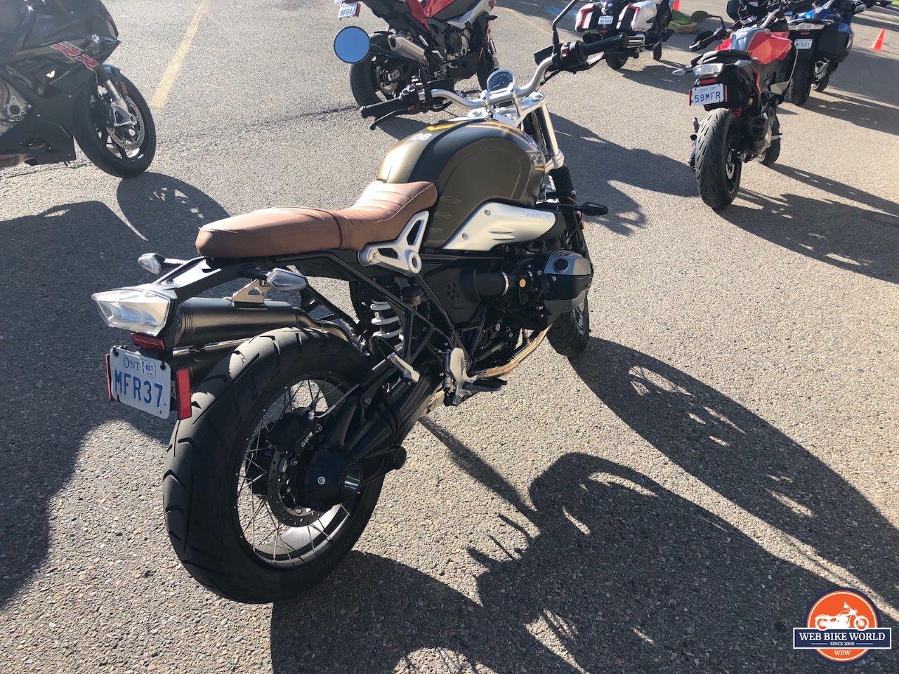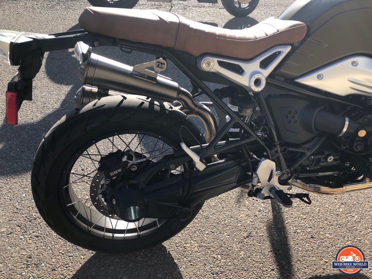 Coming around to the other side, the rear right three-quarter view of the bike includes two pieces of the R NineT Scrambler that impressed the hell out of me. The first was that while many adventure bikes and scramblers out there have chain final drives because of the potential movement the rear wheel will need to go through, BMW took the more sophisticated and very German approach of engineering in a shaft drive that could do the same thing.