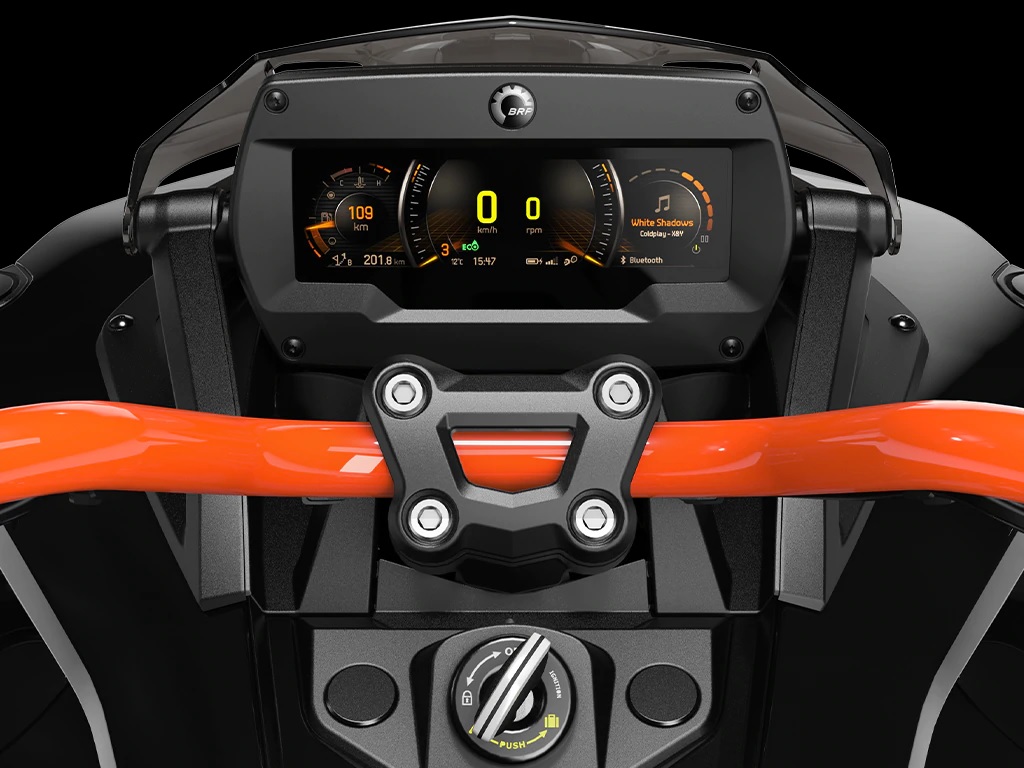 The F3-S enjoys improved handling and more responsive performance thanks to the addition of upgraded FOX gas-charged front suspension. The rear uses a SACHS shock, offering a sporty feel for a smooth ride on demanding roads. The new suspension works well with Can-Am’s Vehicle Stability System package, which includes Traction Control System, Dynamic Power Steering, Hill Hold Control, ABS, and selectable ride modes for the ultimate ride experience.