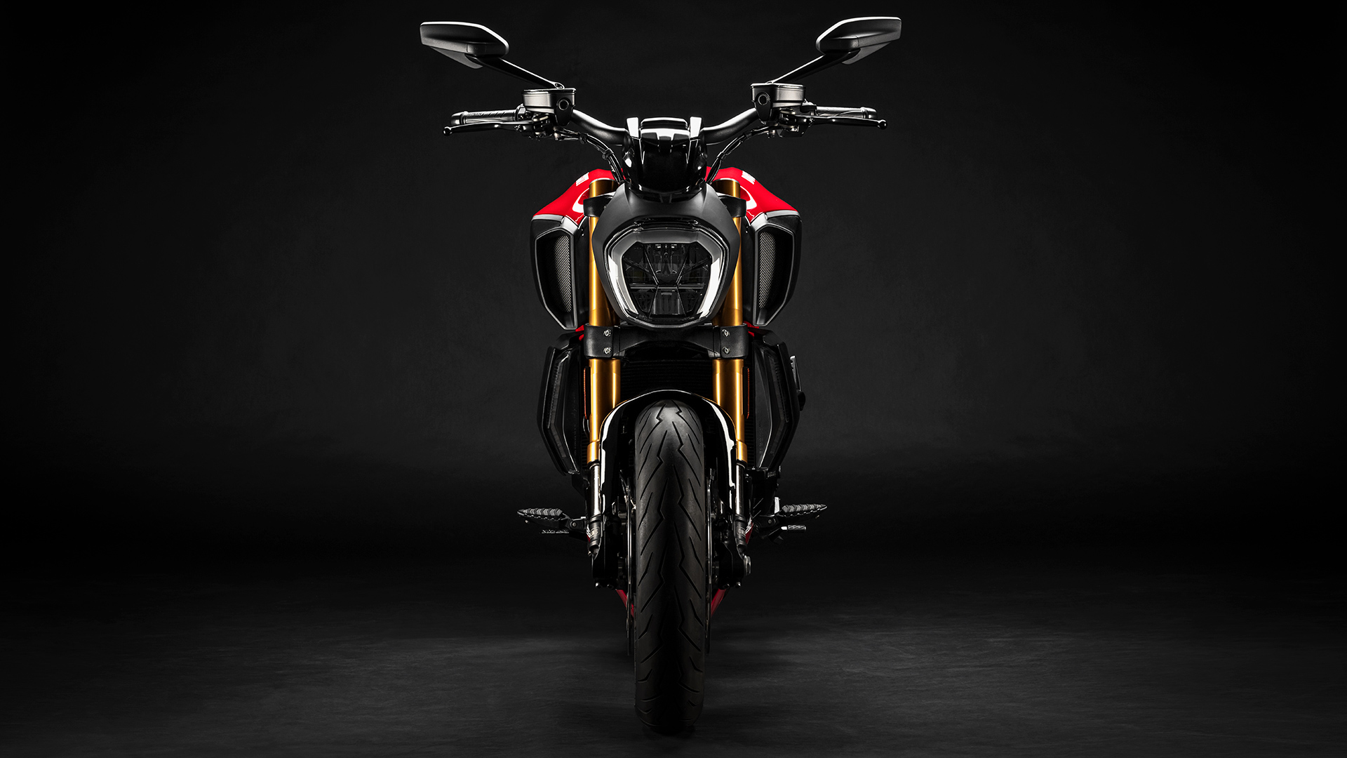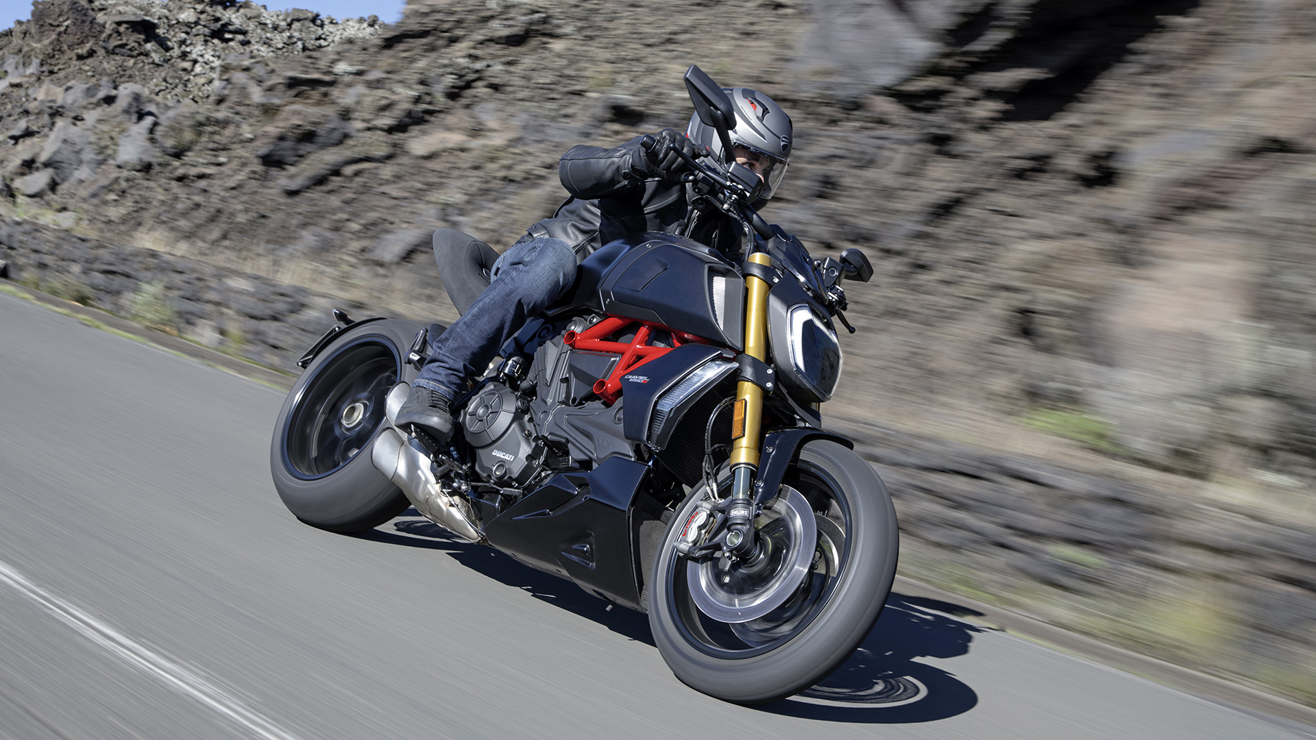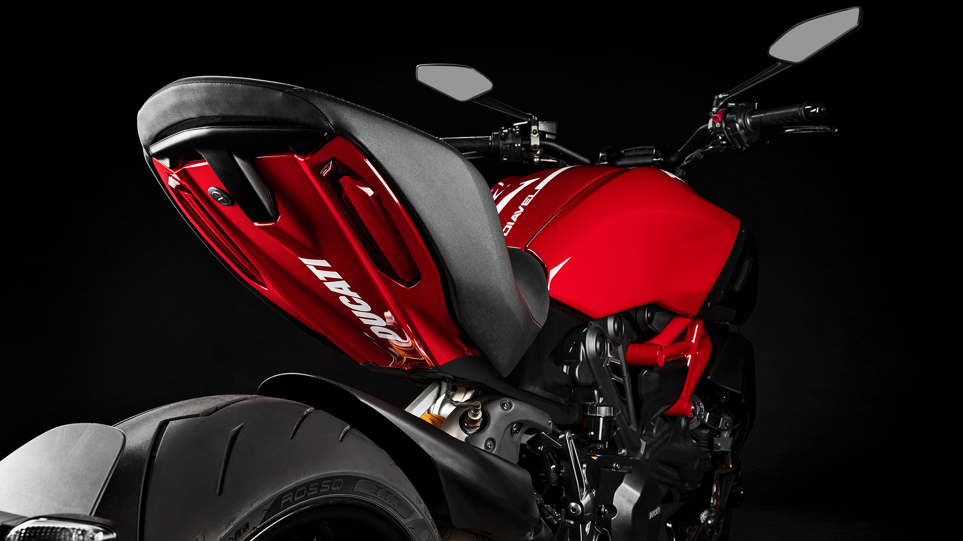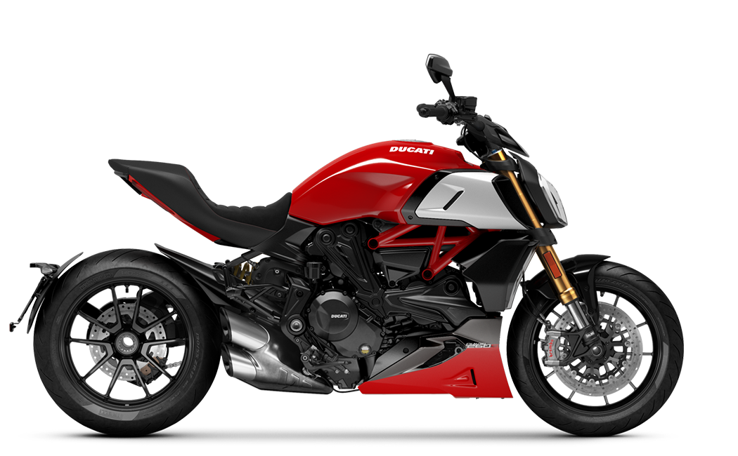 For 2021, the Diavel 1260 S is available in two color options: Total Black with red accents or Ducati Red with white and black accents.