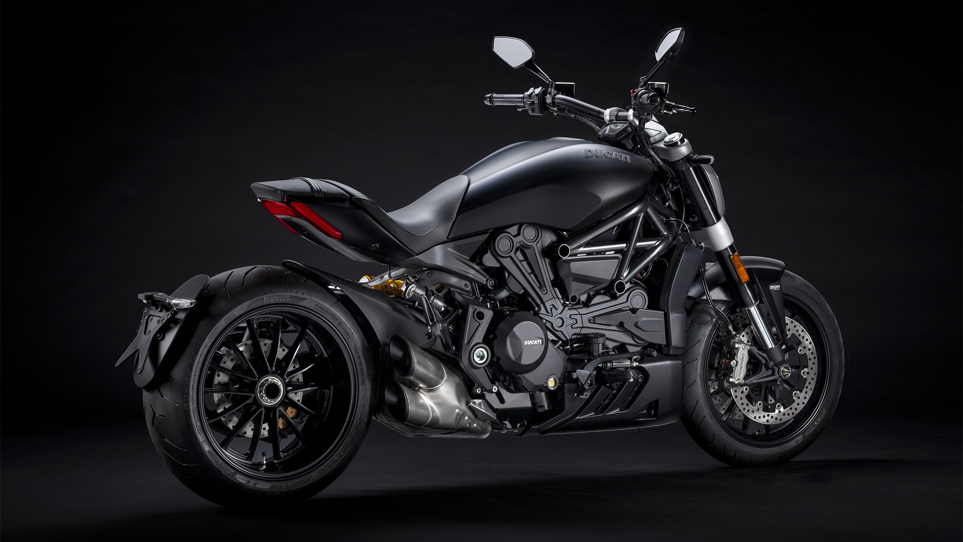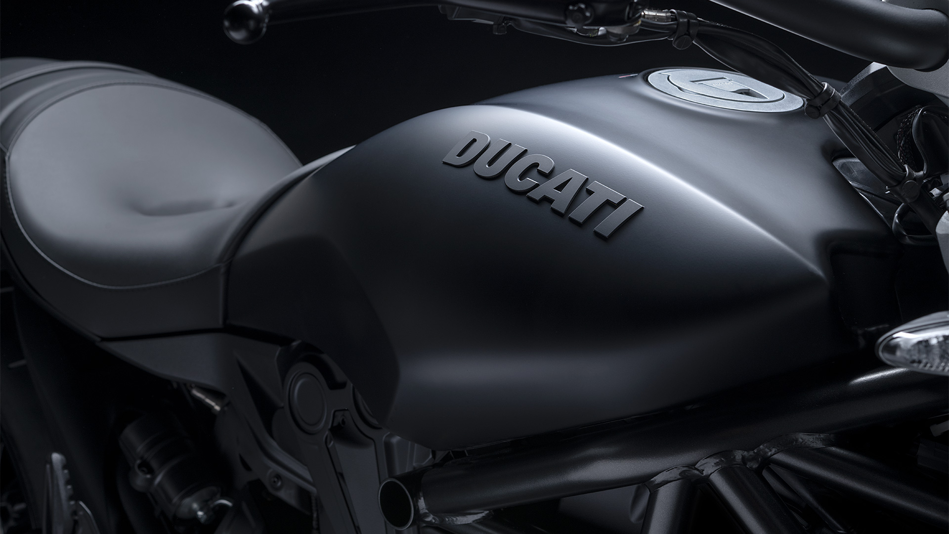 For 2021, the XDiavel Dark is available in a dark color scheme, with Dark Stealth coloring, Carbon Black features and matte black wheels.