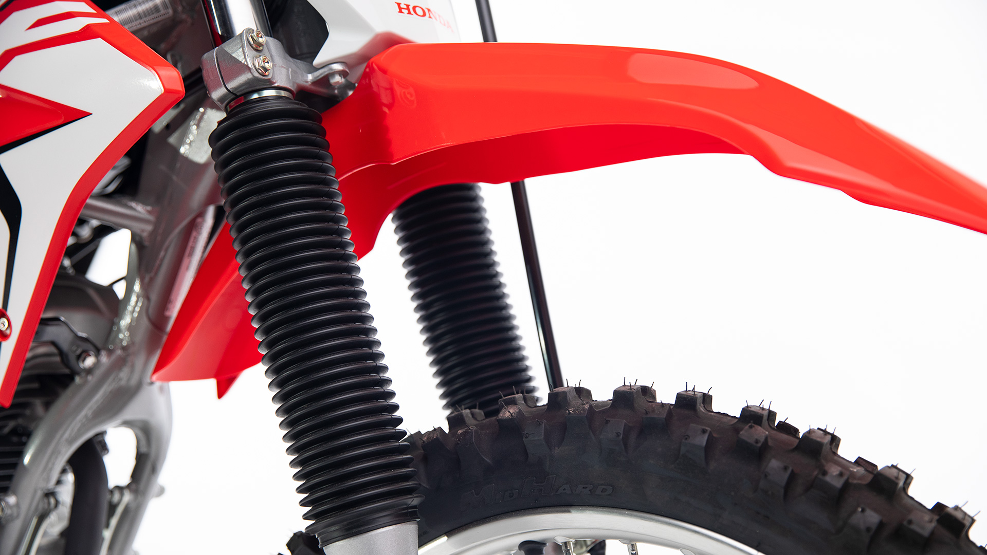 The telescopic Showa® fork features large 41mm sliders. That makes it strong and helps add to the CRF250F’s excellent handling.
