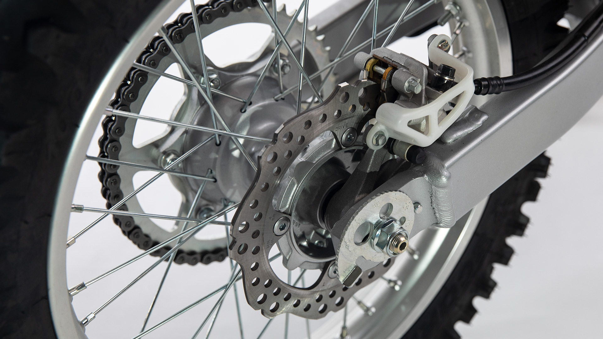 Check out that front brake rotor—the petal-disc design is right off the competitive MX circuit. It’s light, runs cooler, and also helps reduce unsprung weight.