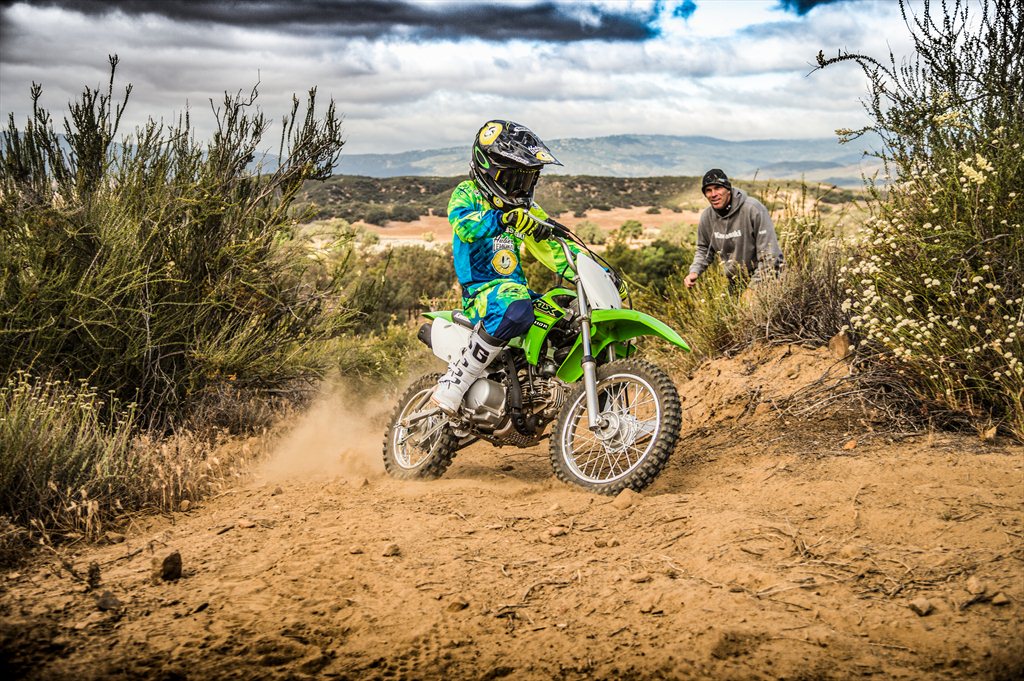 The KLX 110R is the base spec of the two, aimed more at the beginner. Of course, coming from a Japanese company, the bike is durable, reliable, and easy to operate. An electric start, twist-and-go throttle with the automatic transmission, and being extremely light weight, a beginner off-road rider will learn all about weight transfer, cornering, and trail riding techniques on top of a machine that will not let them down.