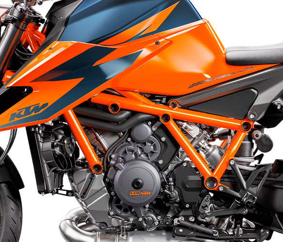 Powered by KTM’s now-legendary LC8 V-twin, it uses 1,301cc’s, 8 titanium valves, and new top-feed injectors mounted in 56mm dual throttle bodies to generate a staggering 177 HP and 106 lb-ft of torque. Mounted as a stressed part of the bike’s steel alloy frame, it can send the Beast from 0 to 60 MPH in 2.7 seconds and will do 0 to 124 MPH in under 8 seconds.
