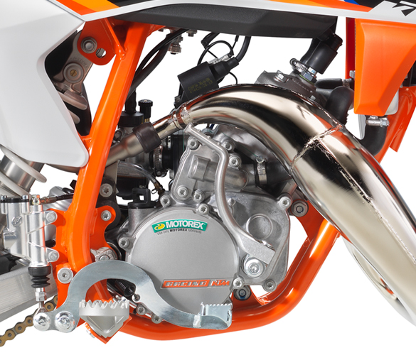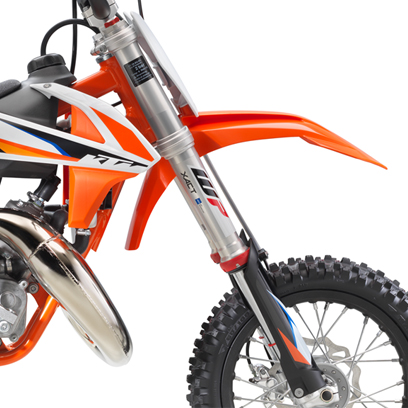 The 2021 KTM model range for the 50 SX includes three bikes, all powered by the same engine: The 50 SX-Mini, the 50 SX, and the 50 SX Factory Edition. The 49cc two-stroke engine produces just about 5.5 HP, more than enough to get the young motocrosser some airtime without sending them into the stratosphere.