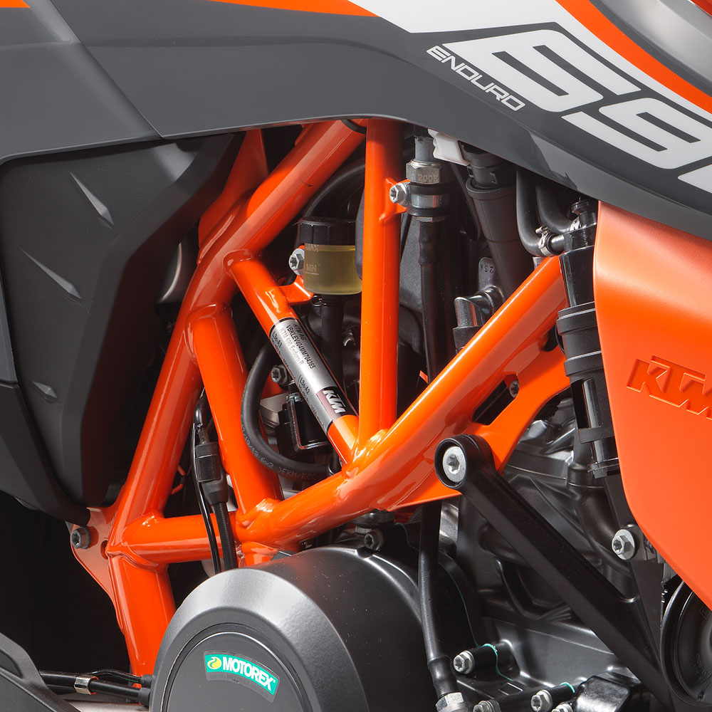 This could be seen as the Austrian company flexing its muscles in engine knowledge, as it also has built-in balancer shafts on both the crankshaft and the cylinder head to reduce overall vibration. It also has developed a lightweight piston head and conrod, to reduce reciprocating mass and improve response. On top of that, KTM has developed a superb engine management and injection system, combined with dual spark plugs, to ensure the most efficient and complete combustion possible in the cylinder.