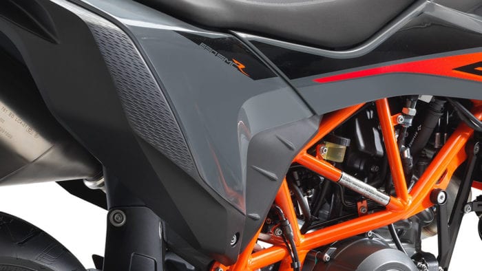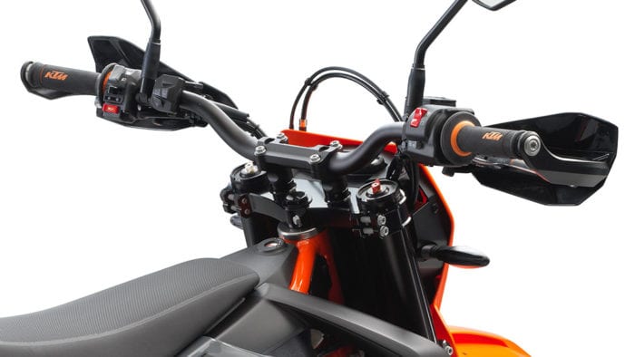 Traction control, electronically assisted quickshifter+, dual-zone ABS with cornering control, and a throttle-by-wire system are all standard. The ECU has two modes, controlled with a thumb switch: Street, which has all rider aids and safety aids enabled, and SuperMoto, which disengages rear wheel ABS, rear wheel traction control, and cornering control, allowing the rear wheel to lock, slide, spin up, or push the bike into a wheelie as needed.