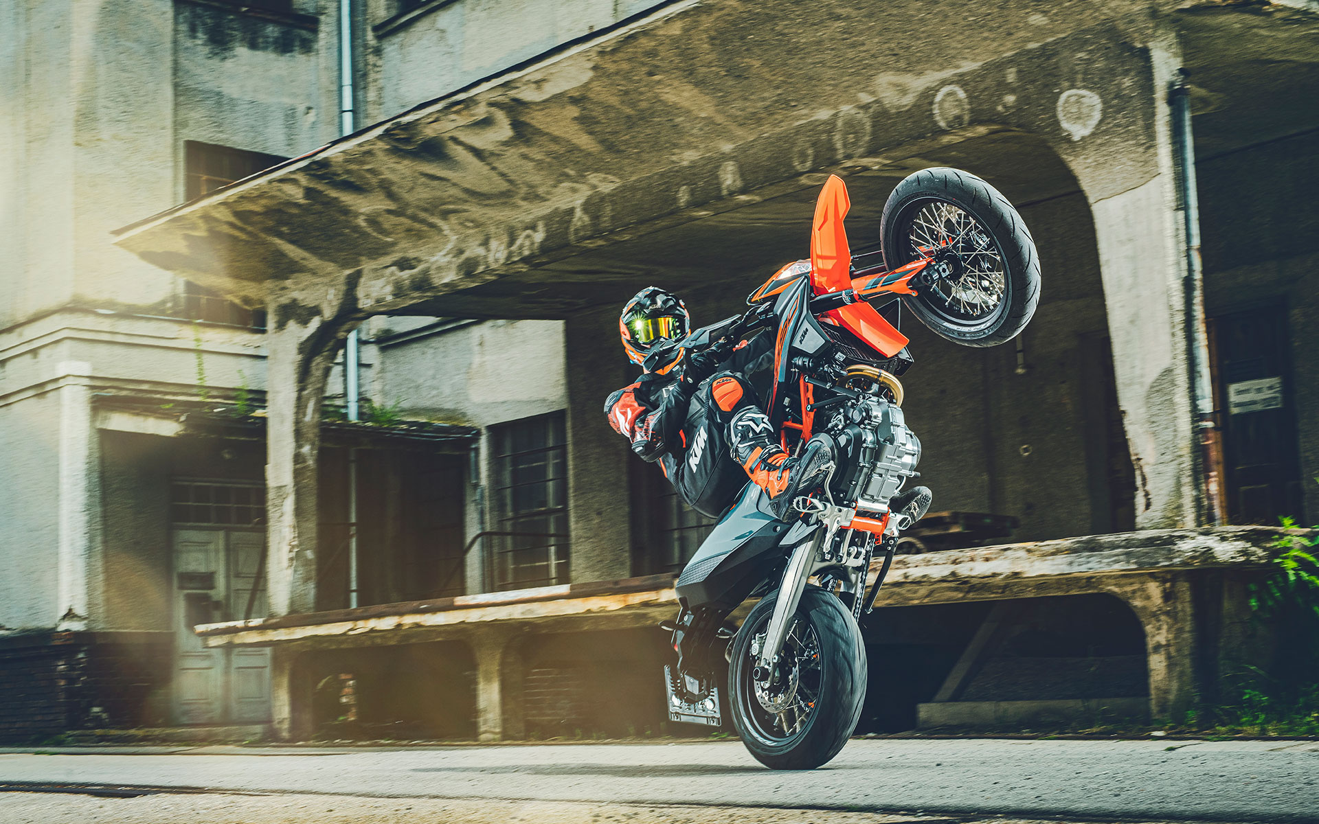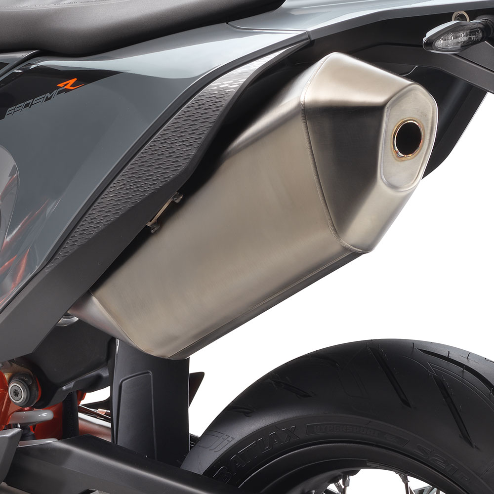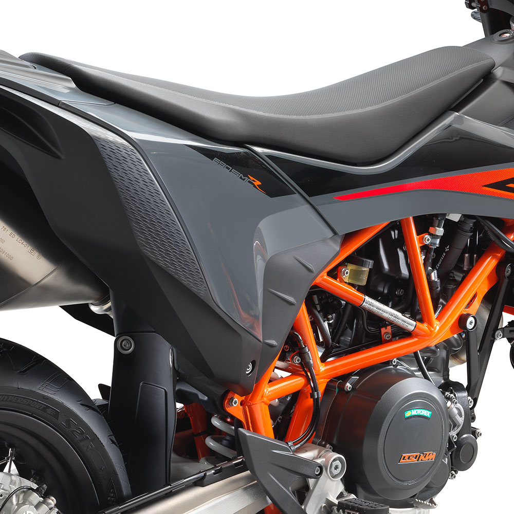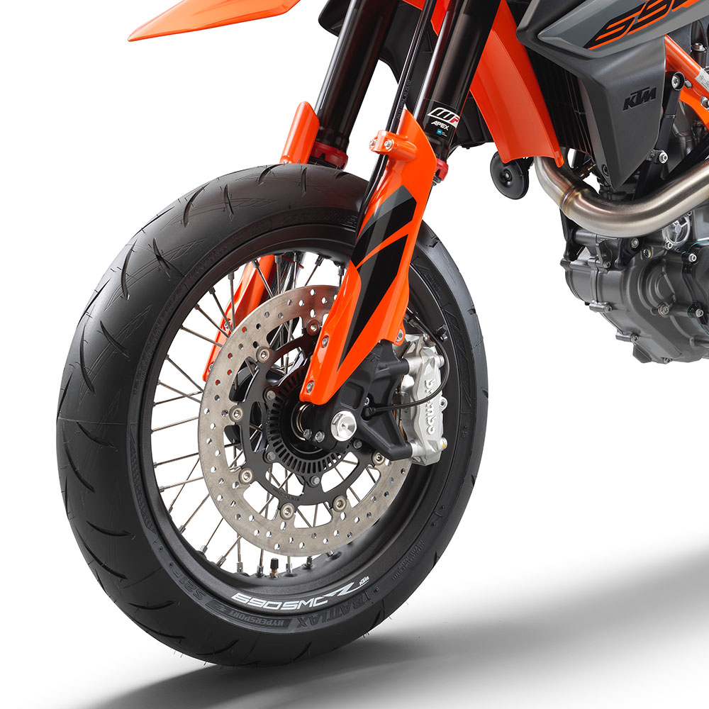 Traction control, electronically assisted quickshifter+, dual-zone ABS with cornering control, and a throttle-by-wire system are all standard. The ECU has two modes, controlled with a thumb switch: Street, which has all rider aids and safety aids enabled, and SuperMoto, which disengages rear wheel ABS, rear wheel traction control, and cornering control, allowing the rear wheel to lock, slide, spin up, or push the bike into a wheelie as needed.