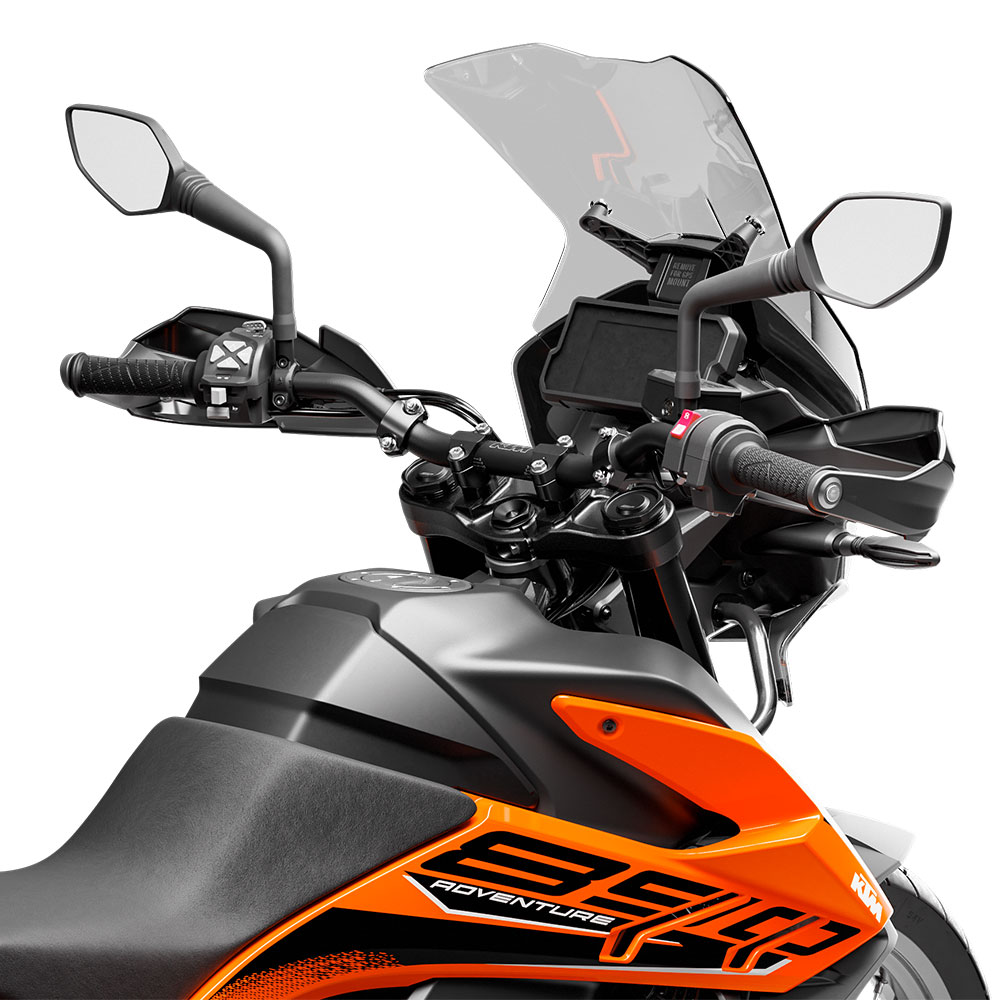 The 890 Adventure R has all the same electronics, TFT display, LED lighting, and engine of the 890 Adventure, but replaces the stock suspension with off-road, fully adjustable WP shocks. It also replaces the comfortable, wide seat of the base model with a long enduro-style stepped seat so that the rider can move forwards or backwards freely, to adjust the center of balance of the bike as needed.