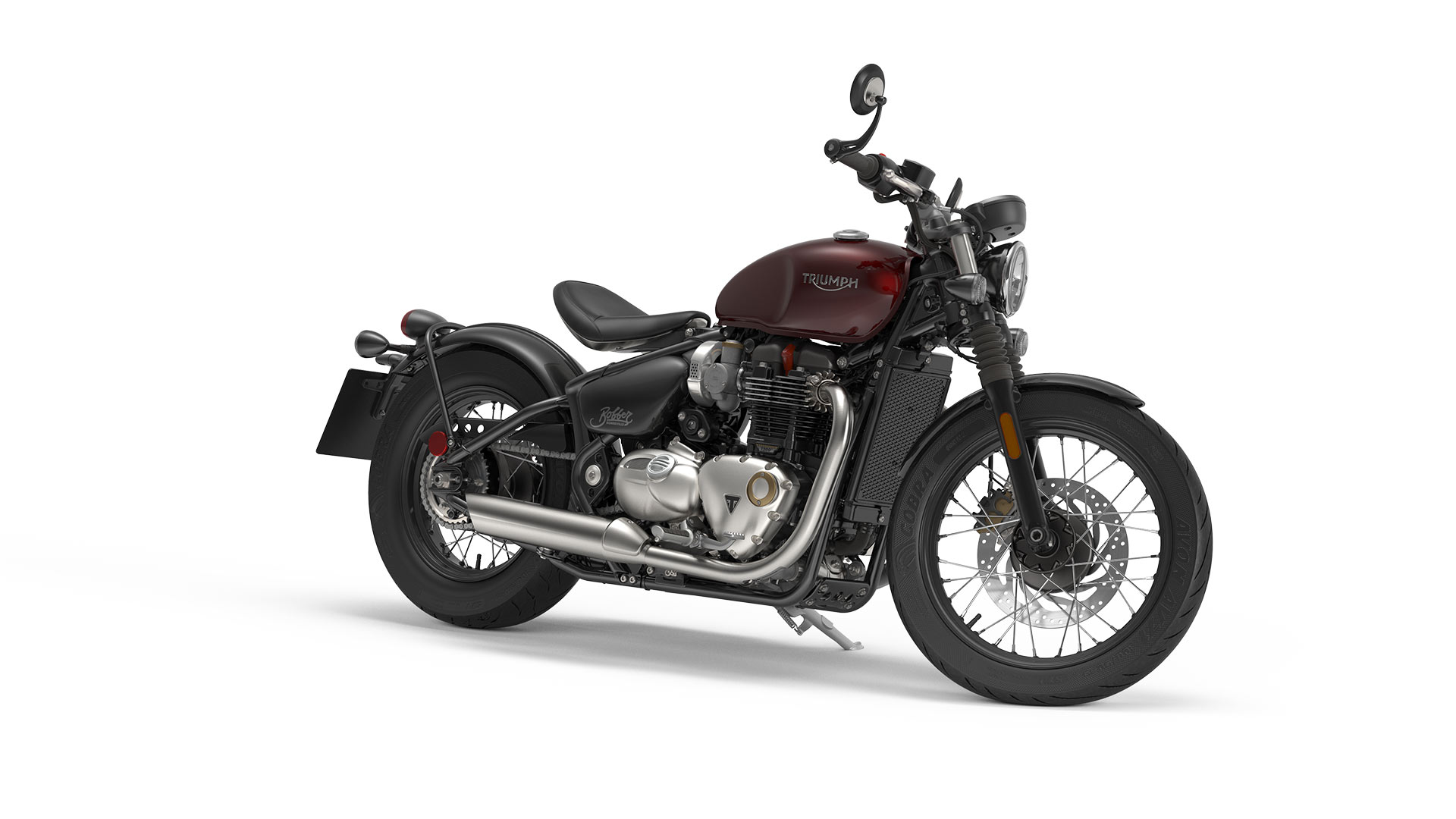 For 2021, the Triumph Bonneville Bobber is available in four color options: Korosi Red and Silver Ice, Khaki Green, Morello-Red, and Jet Black. An additional model, the Triumph Bonneville Bobber Black is available with a blacked-out aesthetic.