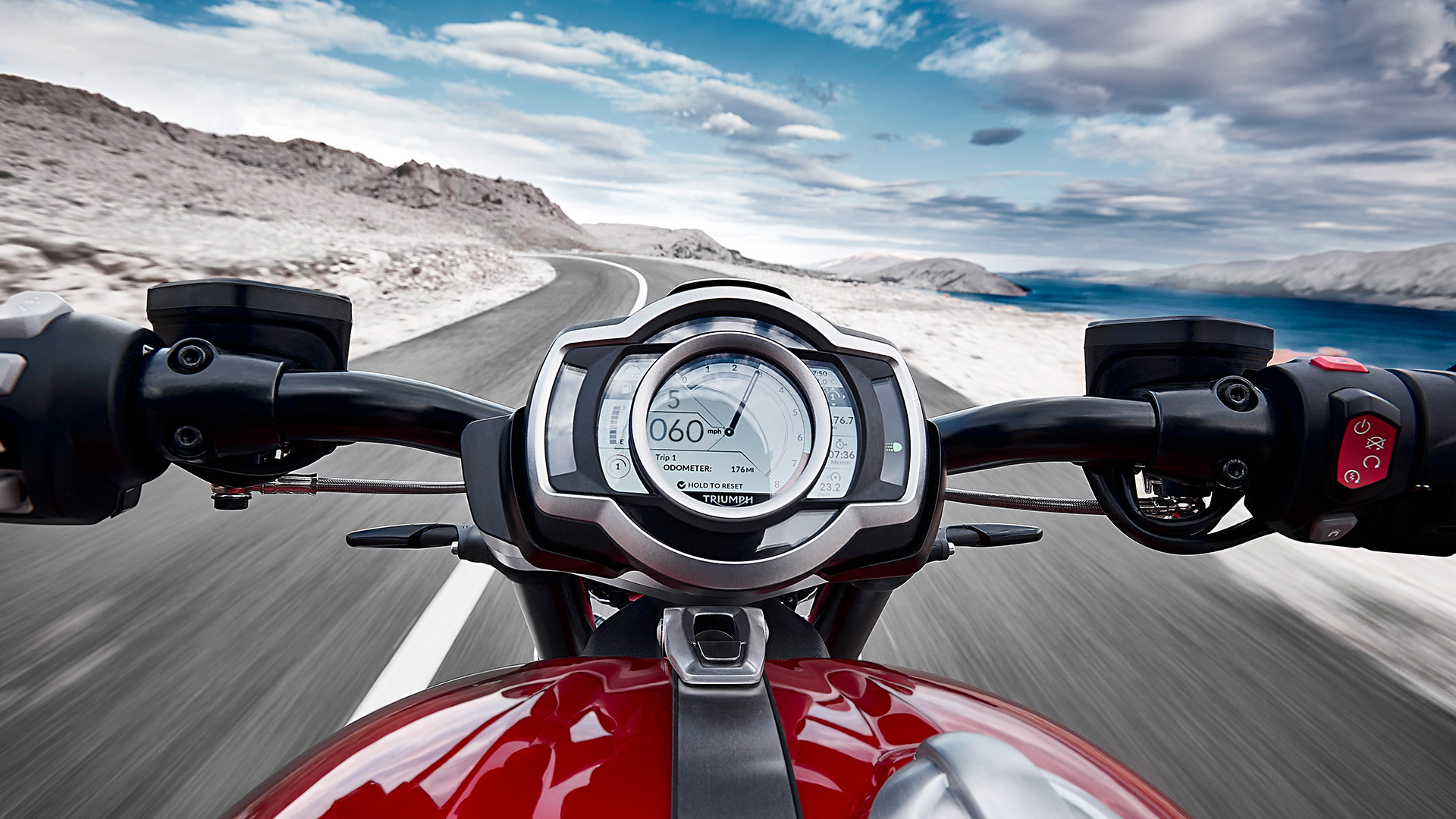 In addition, on top of the optimized cornering ABS and traction control, other Rocket 3 technology highlights include four riding modes (Road, Rain, Sport and Rider-Configurable), hill hold control, cruise control, keyless ignition and steering lock, with heated grips as standard on the Rocket 3 GT (accessory fit available for the R).