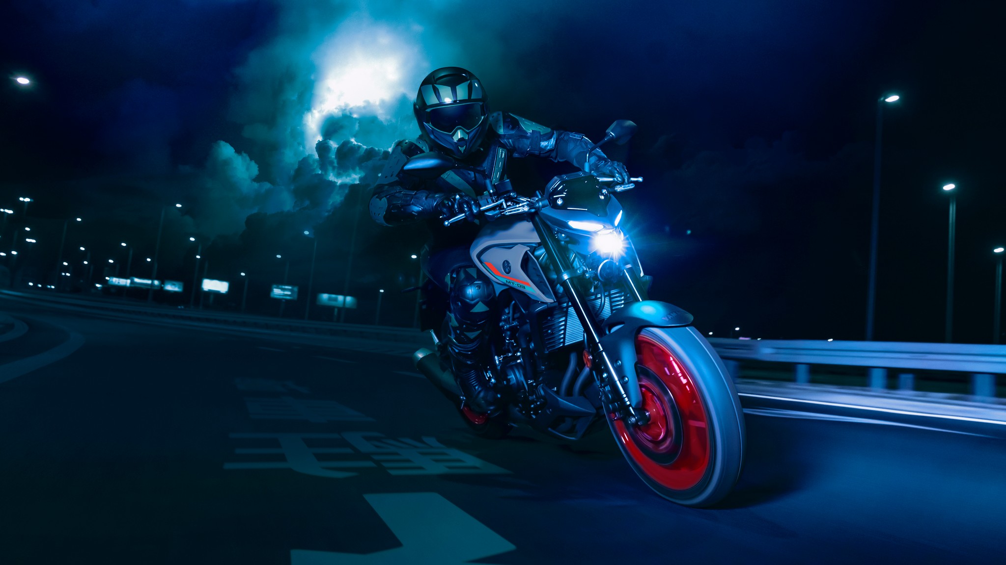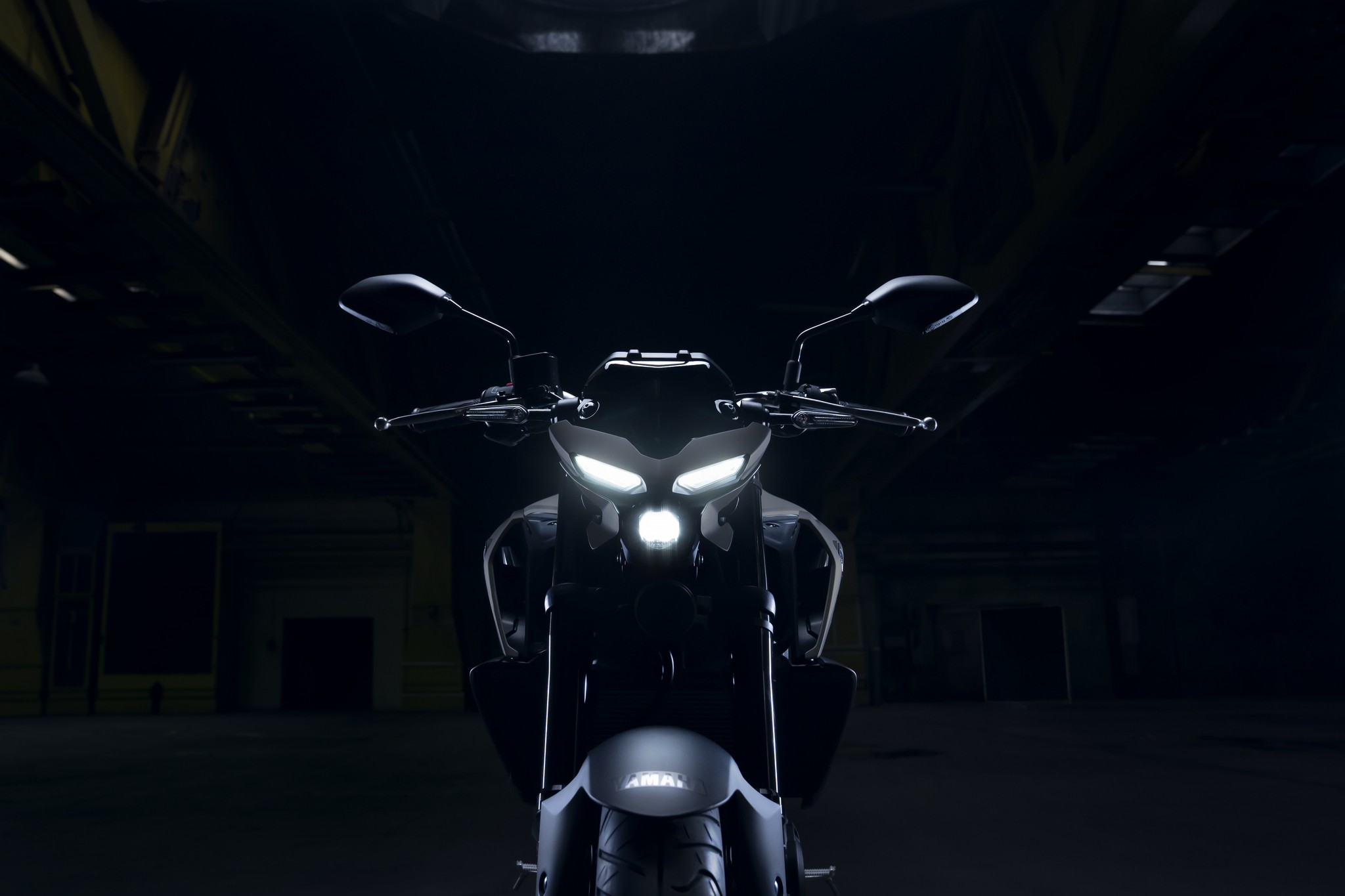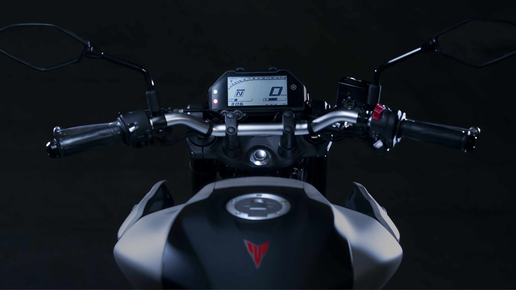 The dynamic MT-03 looks cool with its dual angled position lights that emphasize its aggressive big-bike looks. A single compact and powerful LED headlight burns a hole through the darkness to light up the road ahead.