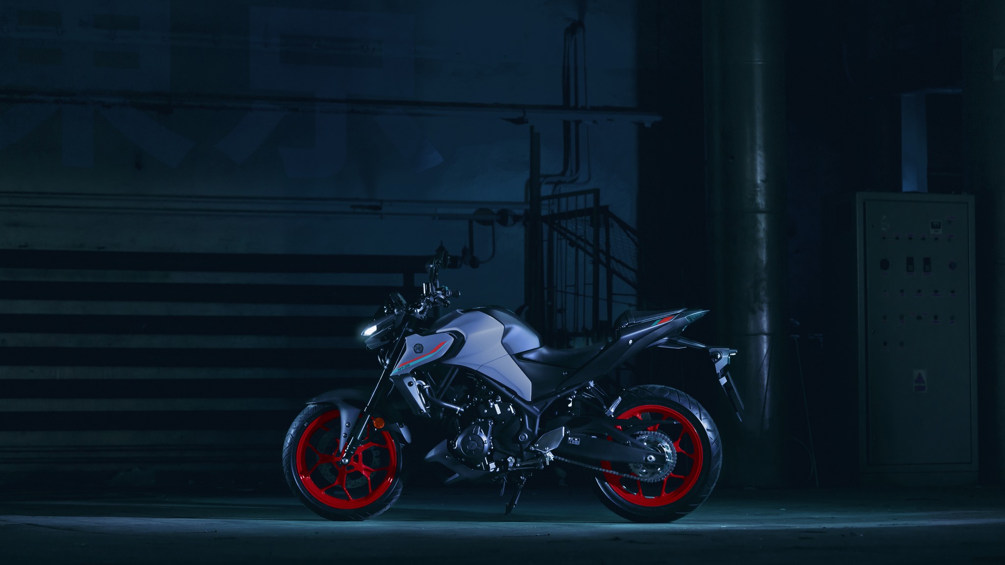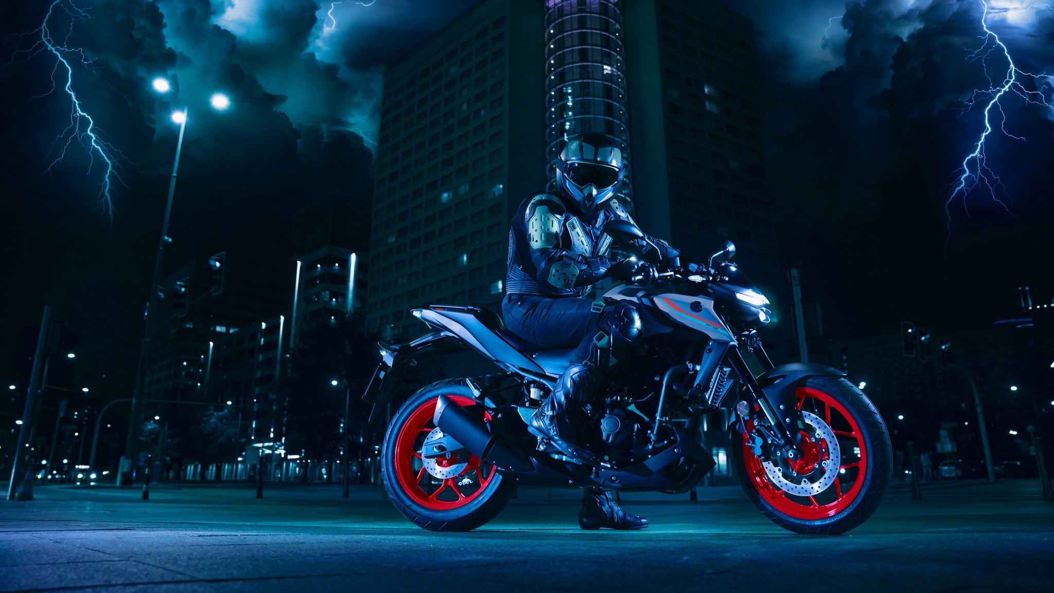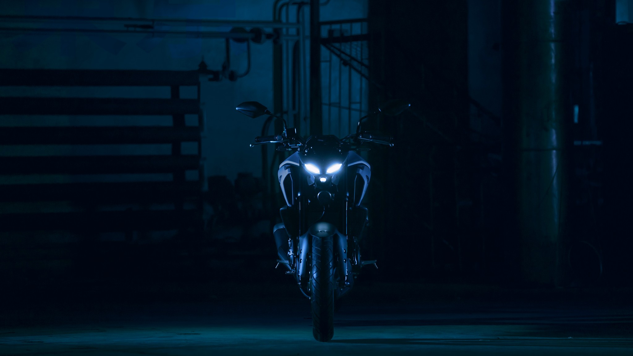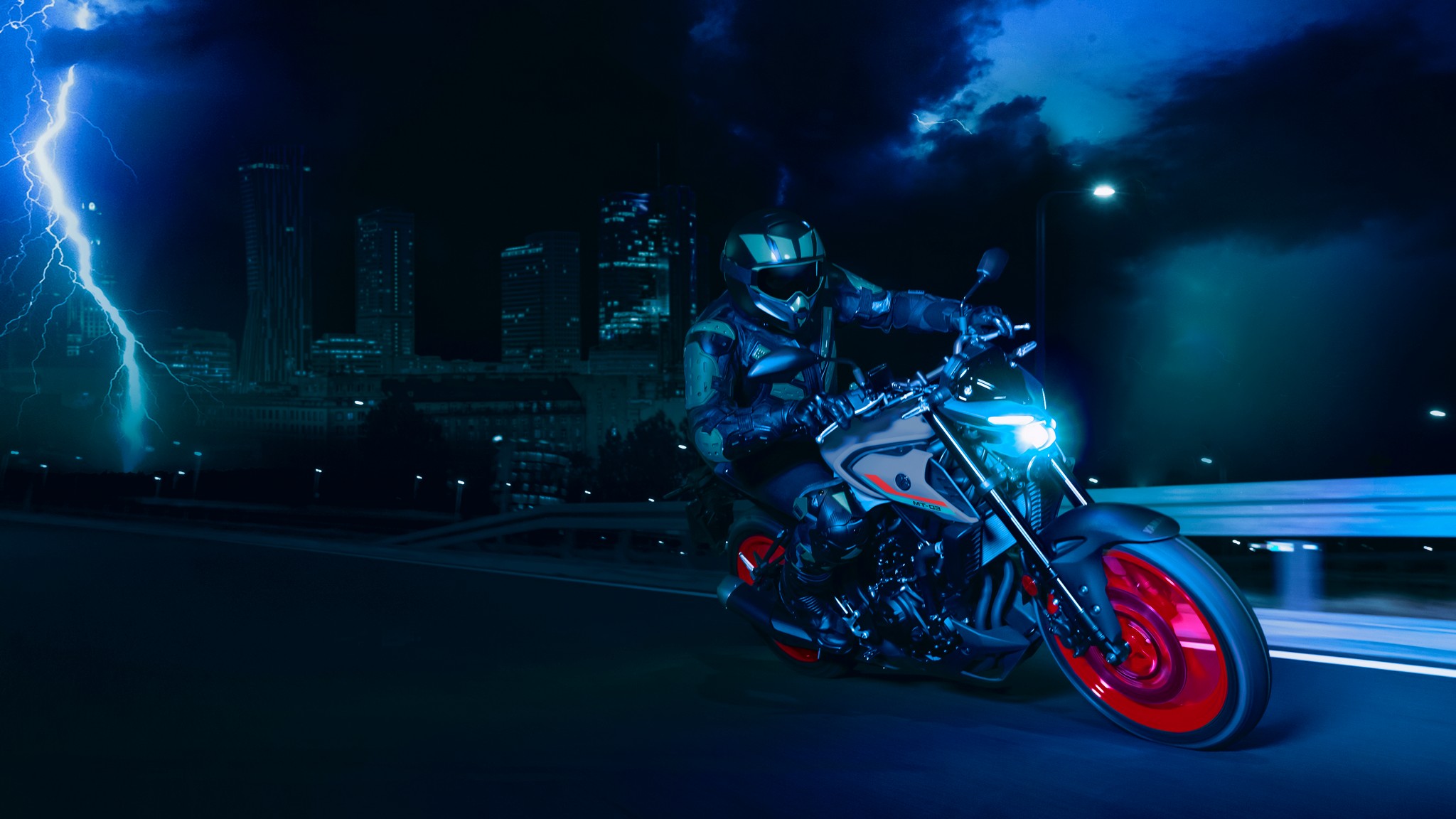 The dynamic MT-03 looks cool with its dual angled position lights that emphasize its aggressive big-bike looks. A single compact and powerful LED headlight burns a hole through the darkness to light up the road ahead.