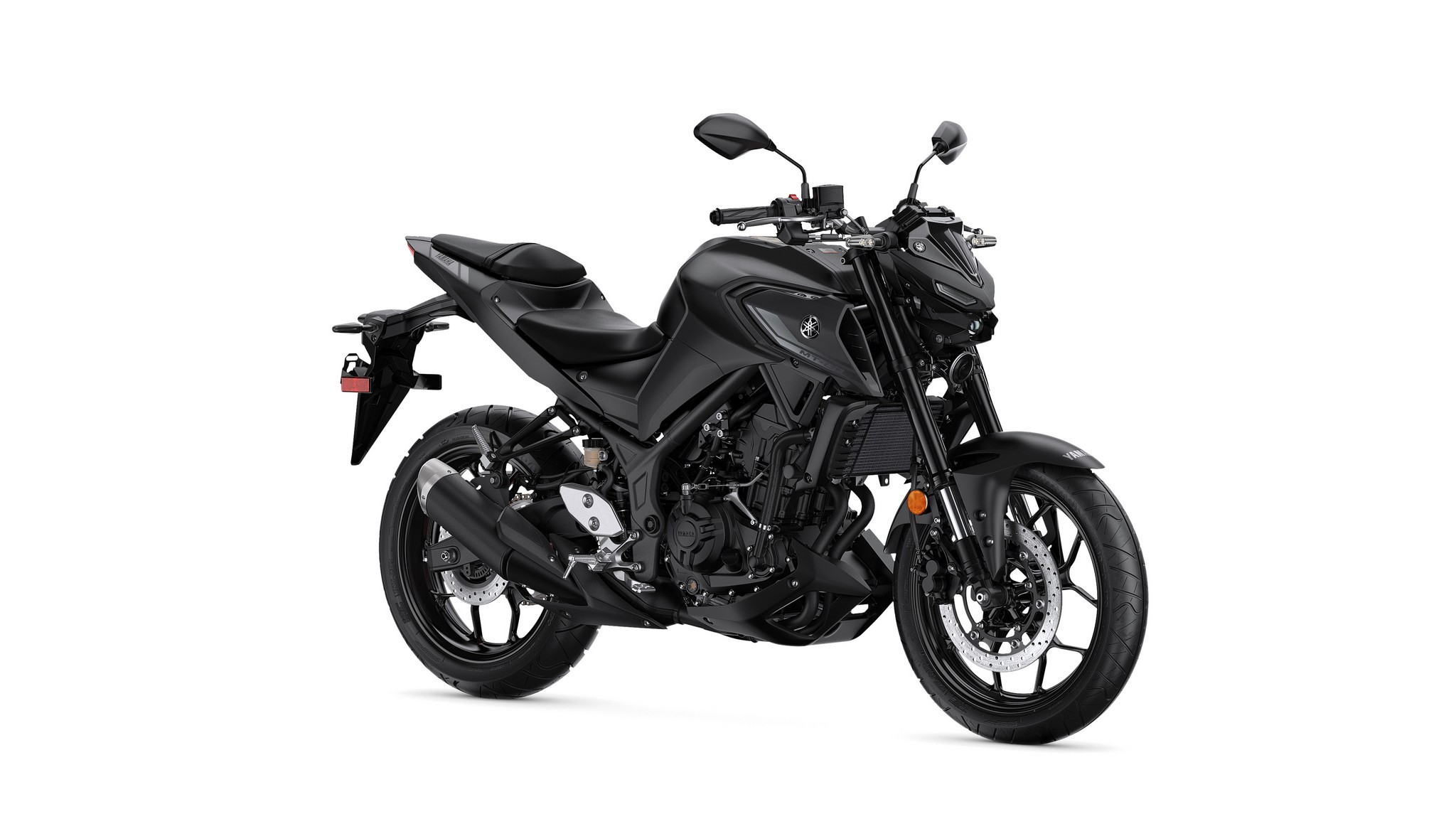 The MT-03’s serious big-bike specification is underlined with the addition of an inverted KYB front fork. Equipped with 37mm tubes and a cast aluminum upper triple clamp, the front end reinforces the bike’s high-specification and delivers a confident and smooth ride during braking, acceleration and cornering.