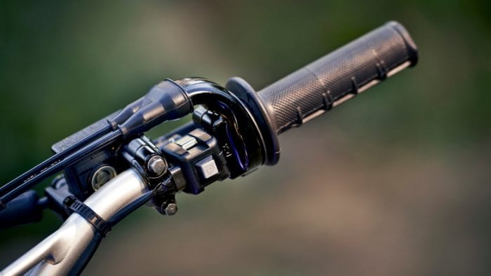 Full-size 21-inch front and 18-inch rear aluminum wheels keep unsprung weight down while knobby tires provide motocross-spec grip.