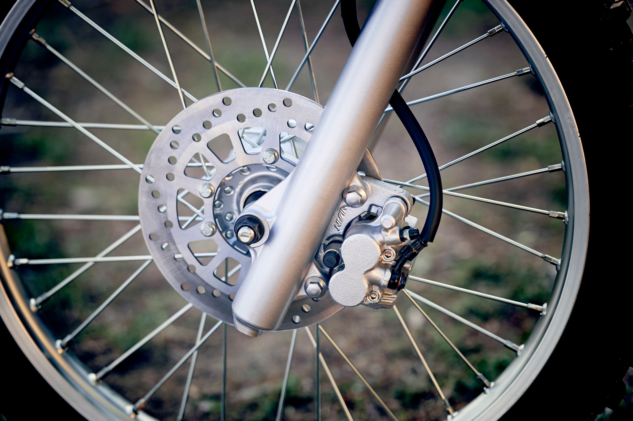 Full-size 21-inch front and 18-inch rear aluminum wheels keep unsprung weight down while knobby tires provide motocross-spec grip.