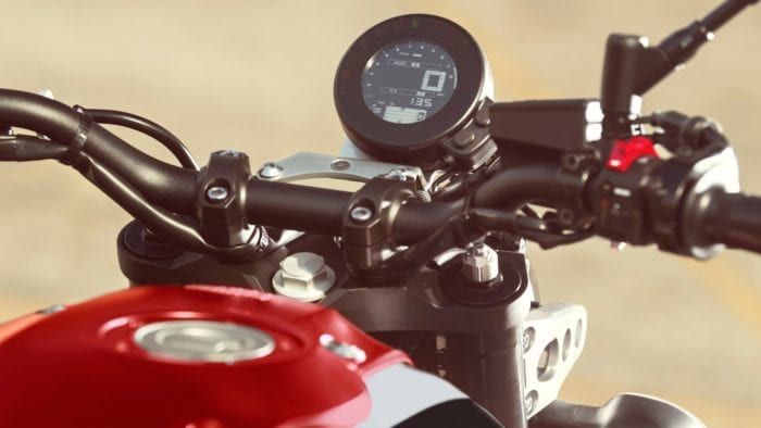 The round LCD panel features a ton of information: digital tachometer, speedometer, gear position, eco mode indicator, TCS and D-MODE indicators, ambient and coolant temperature, a fuel gauge and range of trip computer functions including a clock, instant and average fuel consumption, fuel reserve trip meter and the usual trip meters.