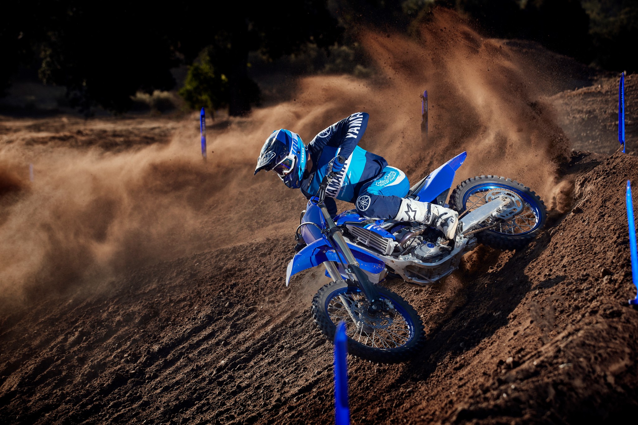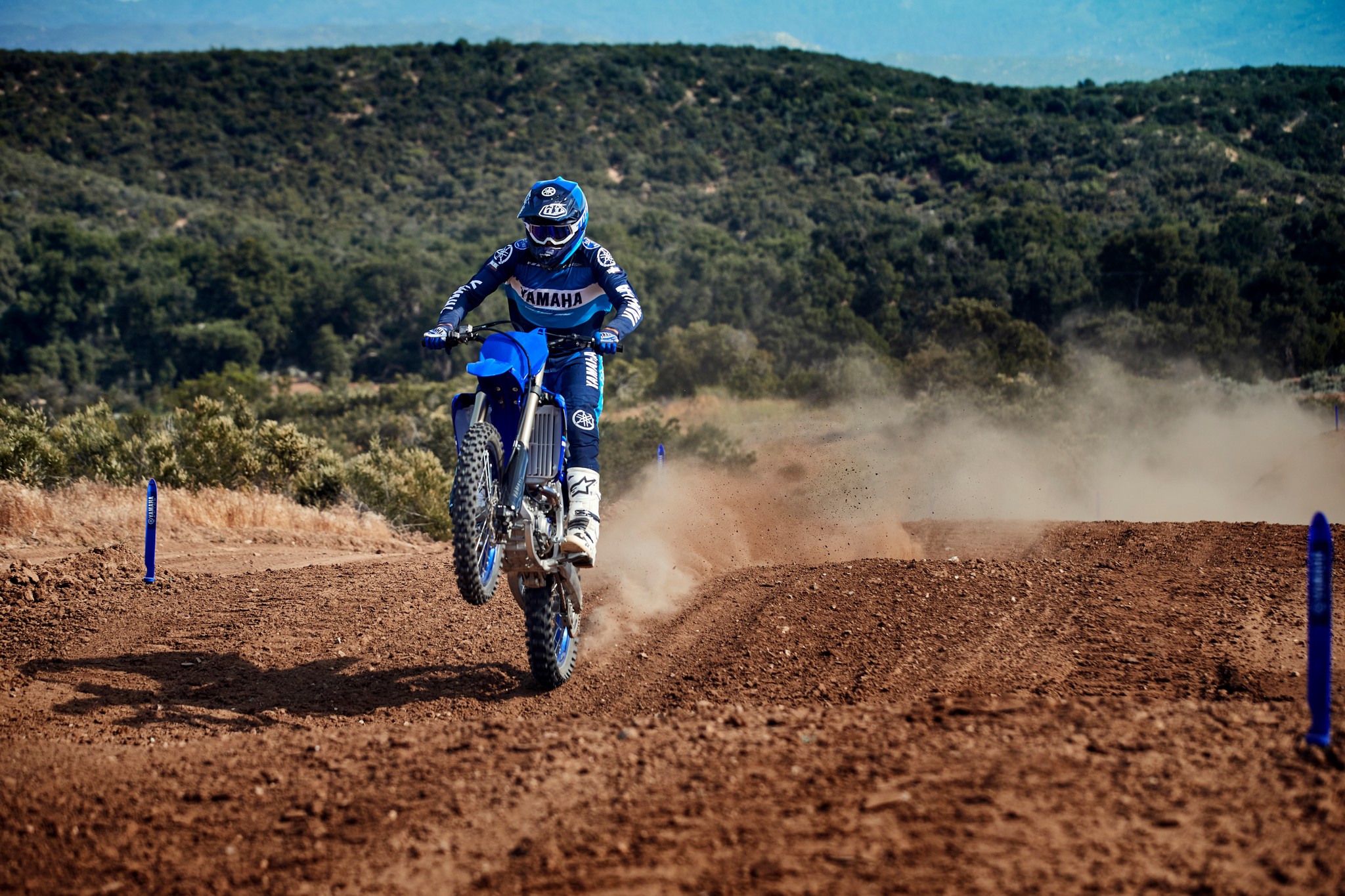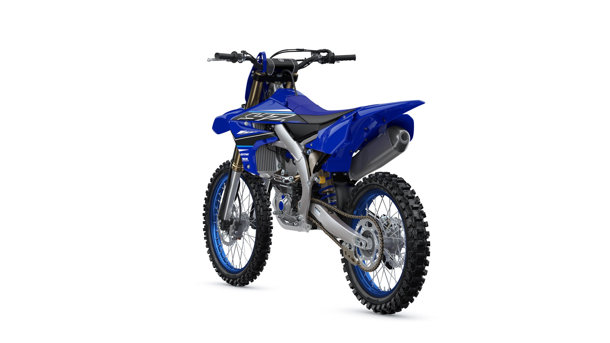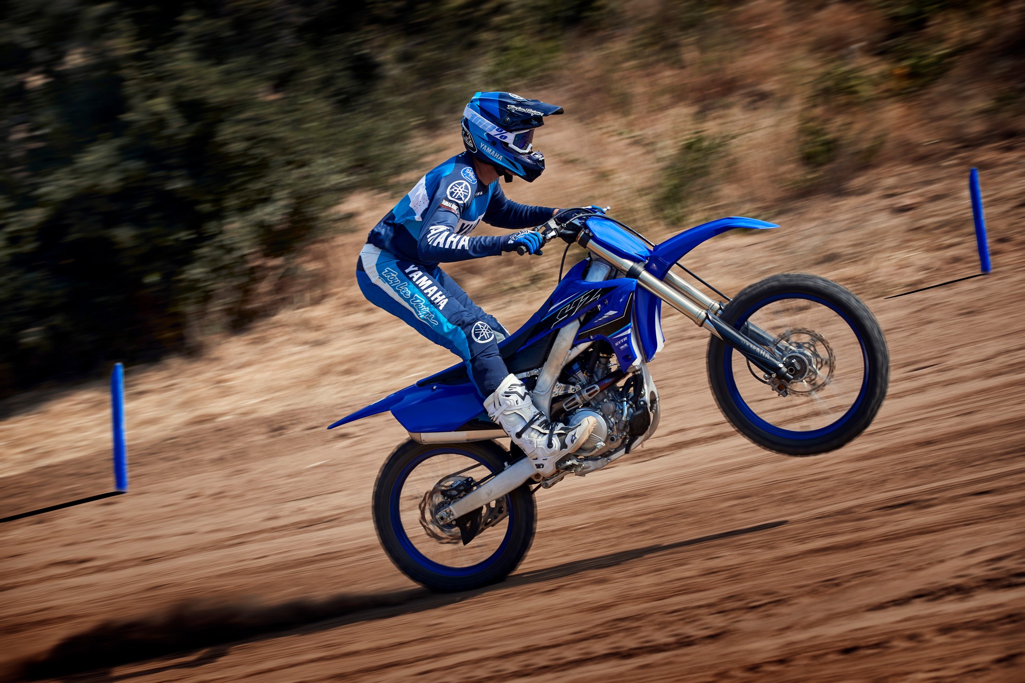 The YZ250F boasts top-spec details including 1-1/8” aluminum tapered handlebars, wide 55mm foot pegs, a quick-adjust clutch perch, stylish blue rims and gold chain.