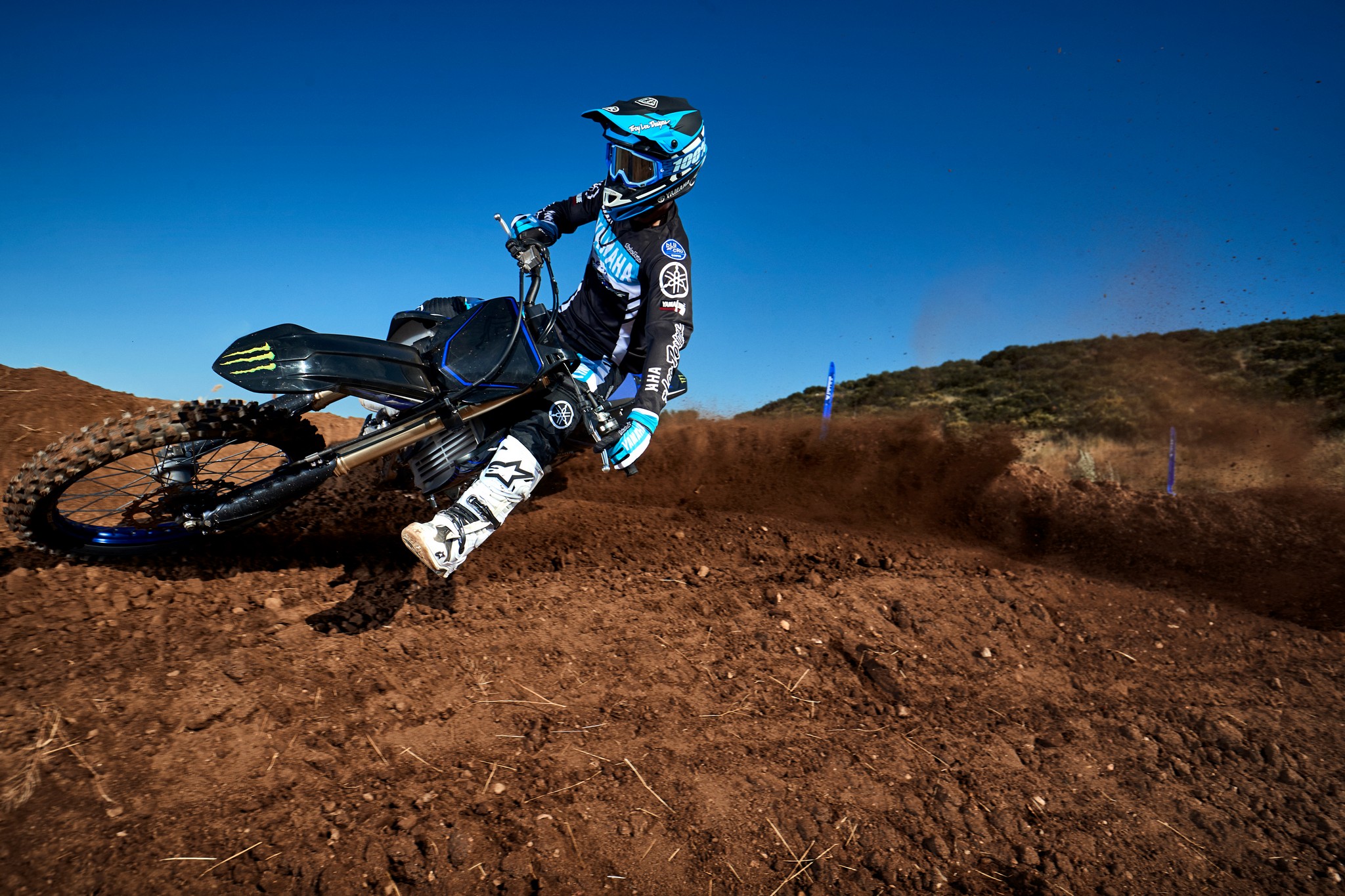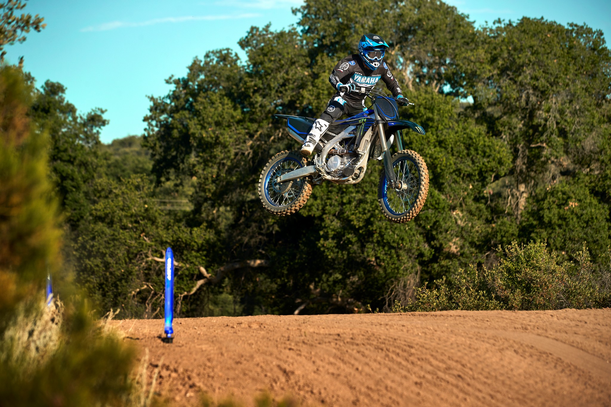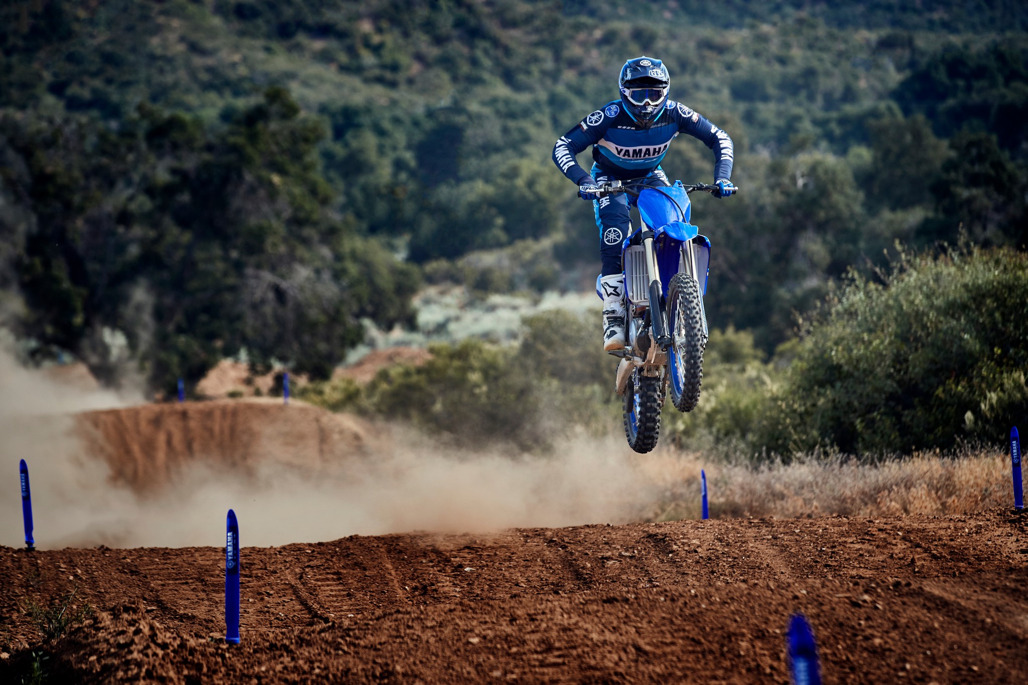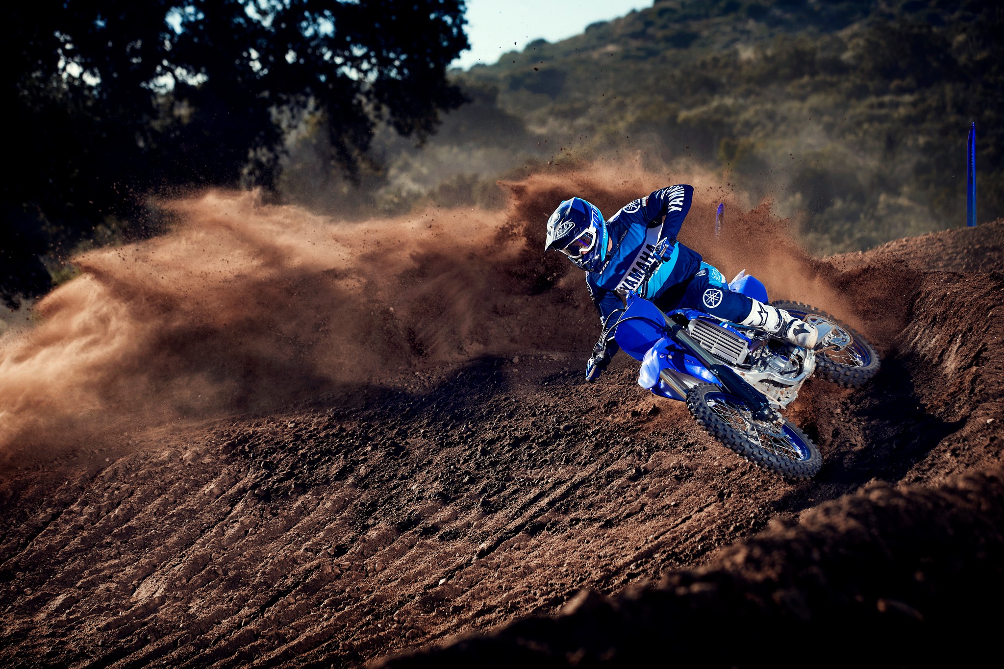 The YZ250F boasts top-spec details including 1-1/8” aluminum tapered handlebars, wide 55mm foot pegs, a quick-adjust clutch perch, stylish blue rims and gold chain.