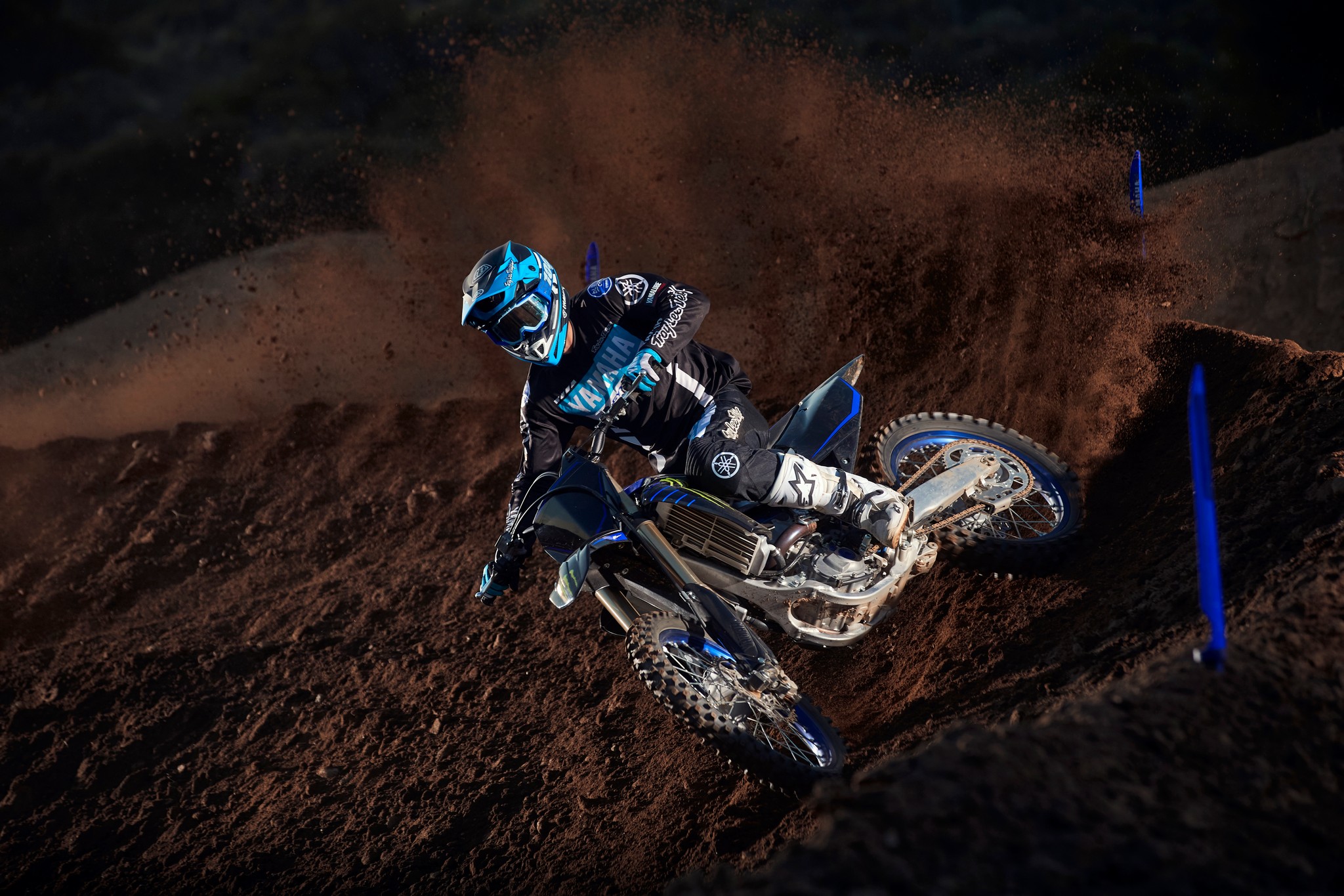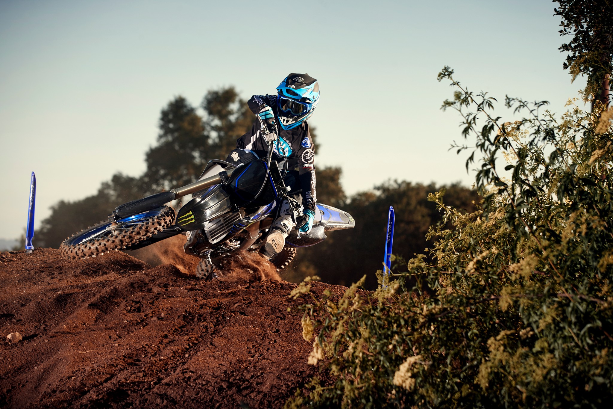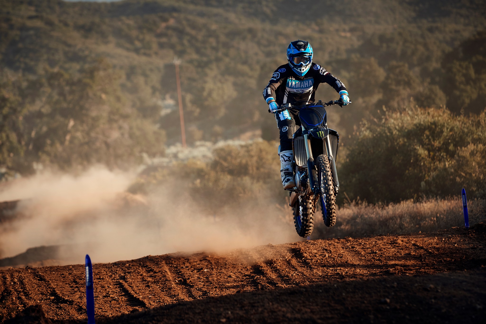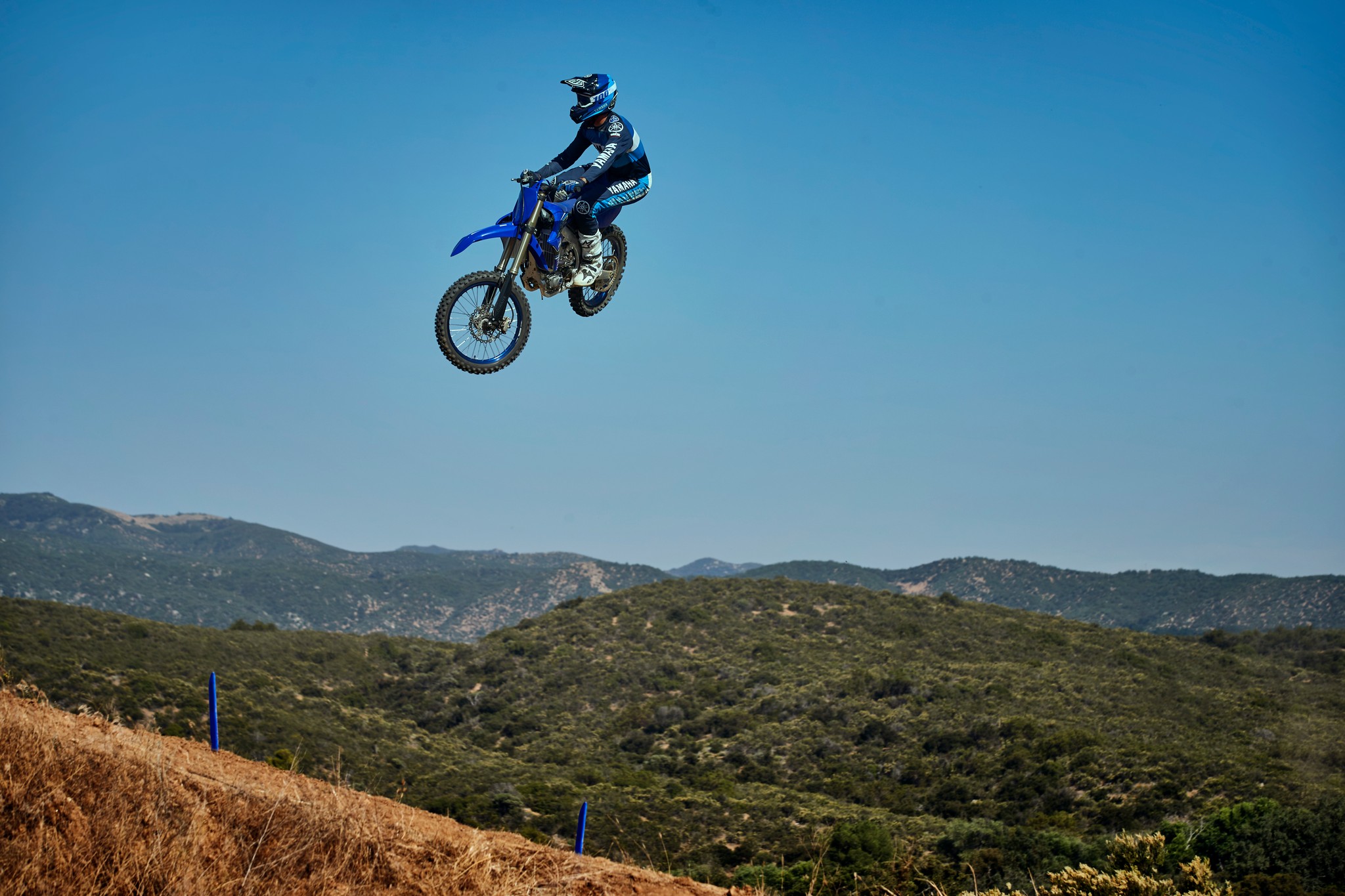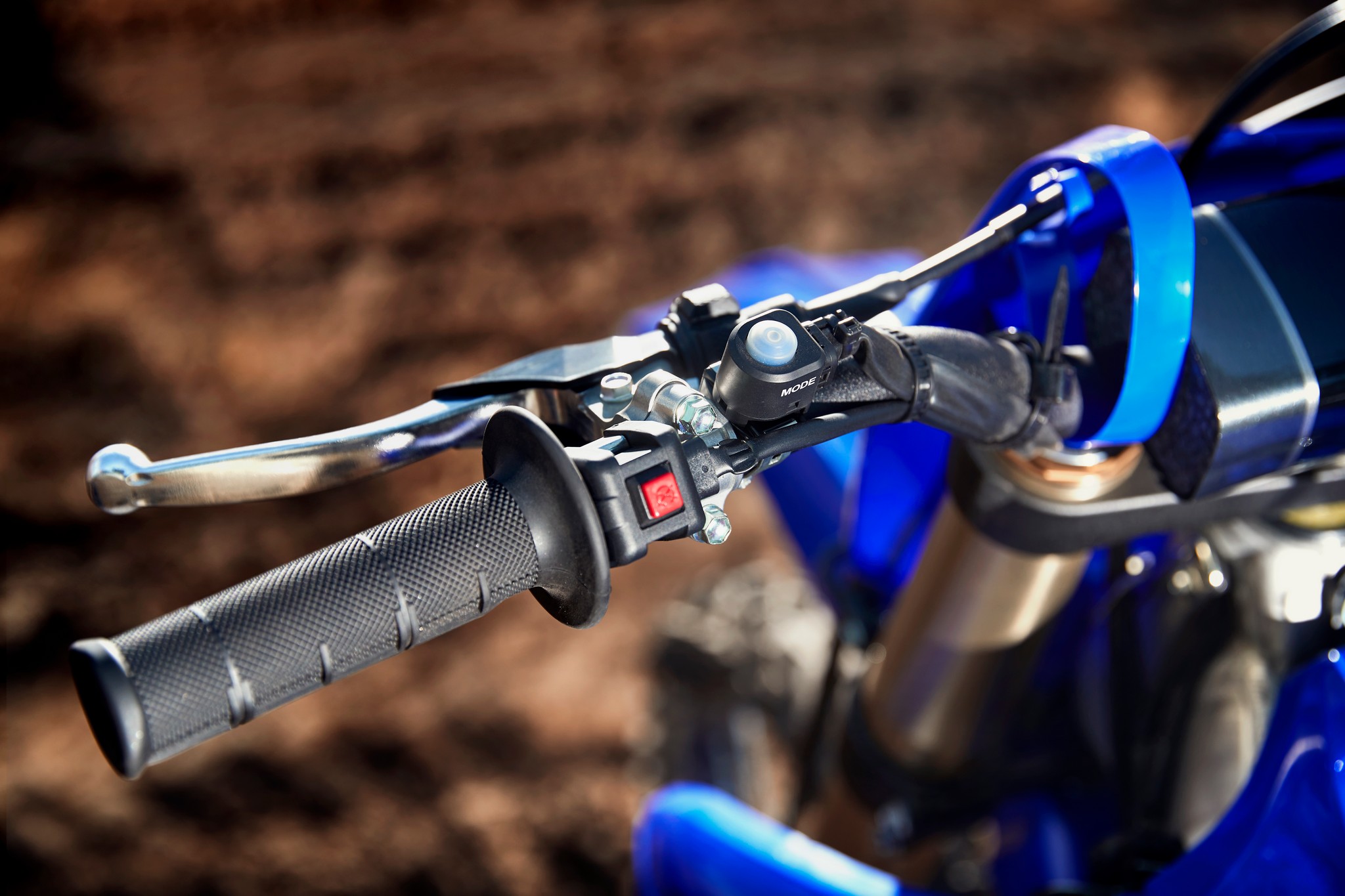 The YZ250F boasts top-spec details including 1-1/8” aluminum tapered handlebars, wide 55mm foot pegs, a quick-adjust clutch perch, stylish blue rims and gold chain.