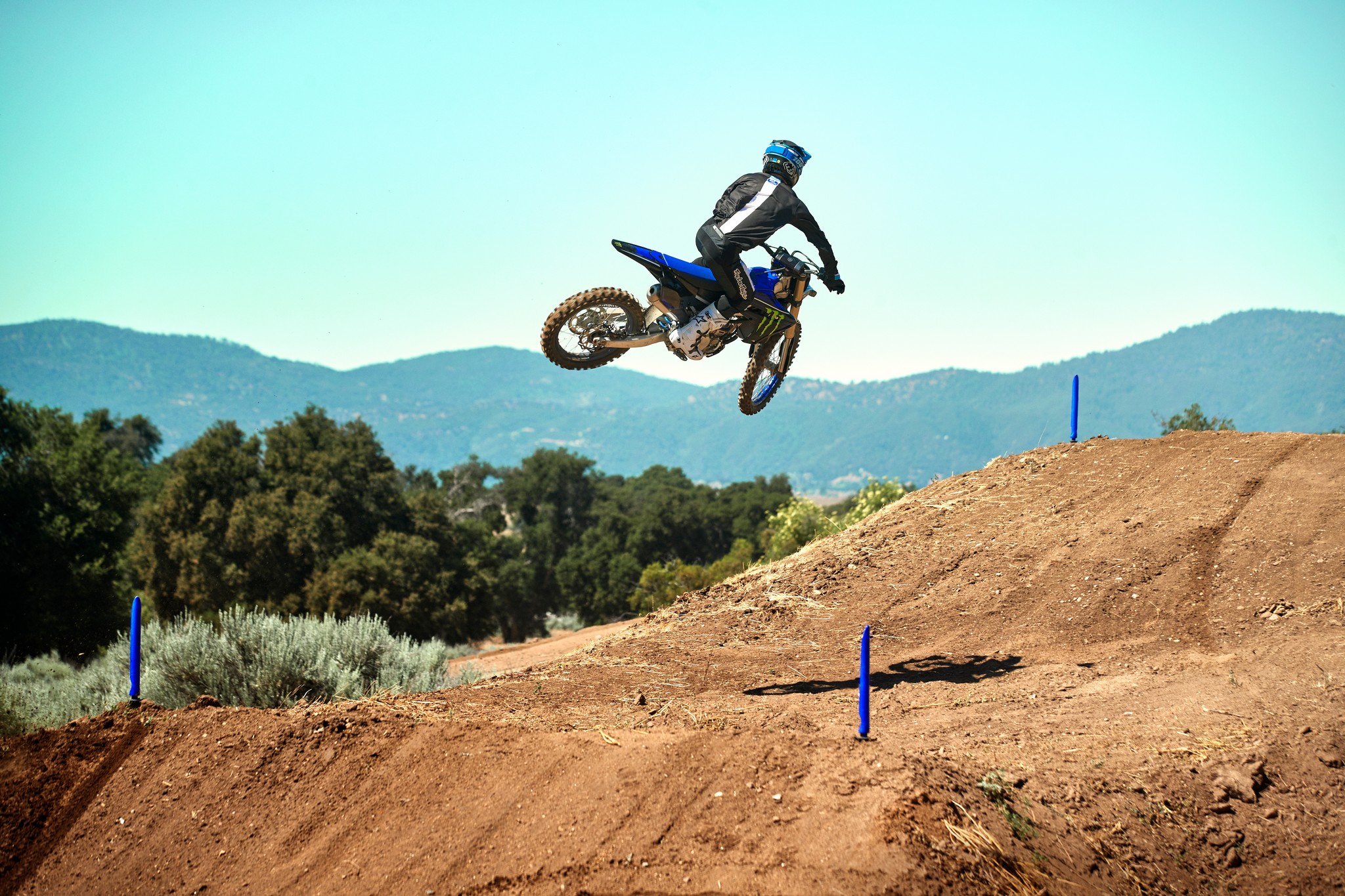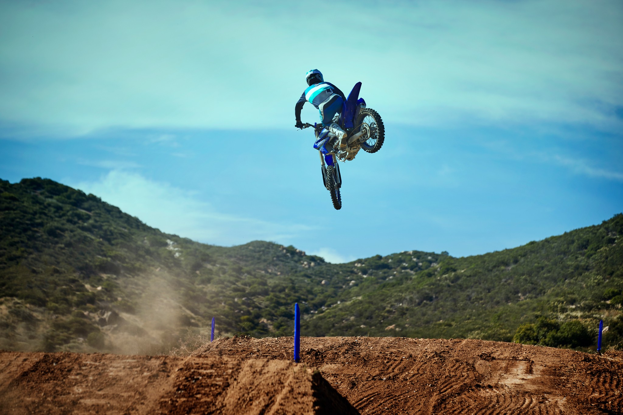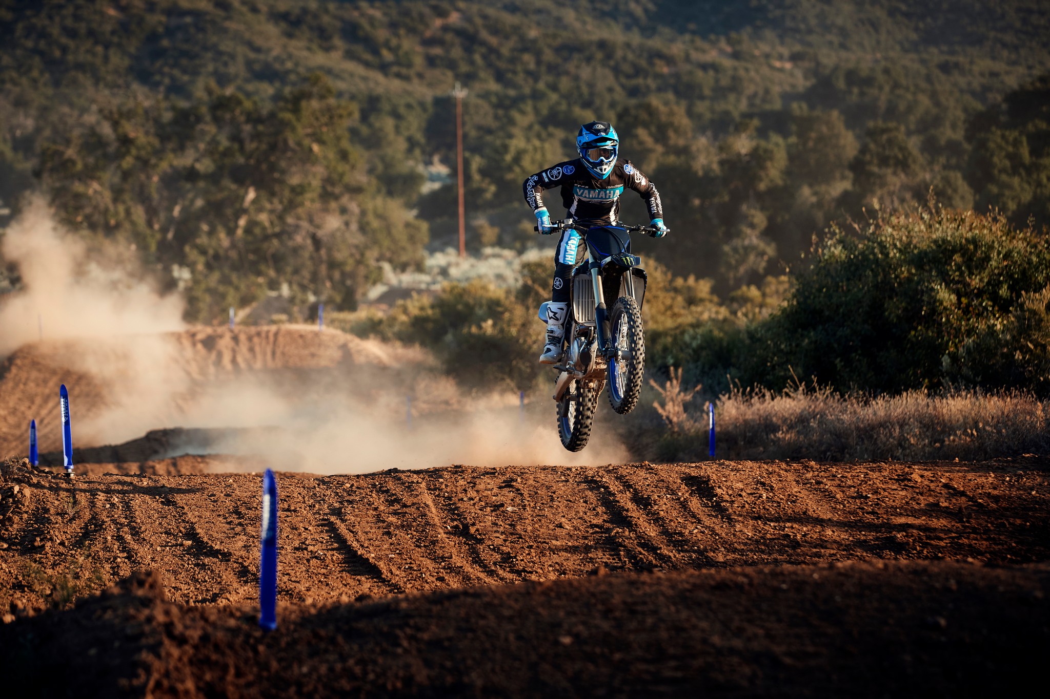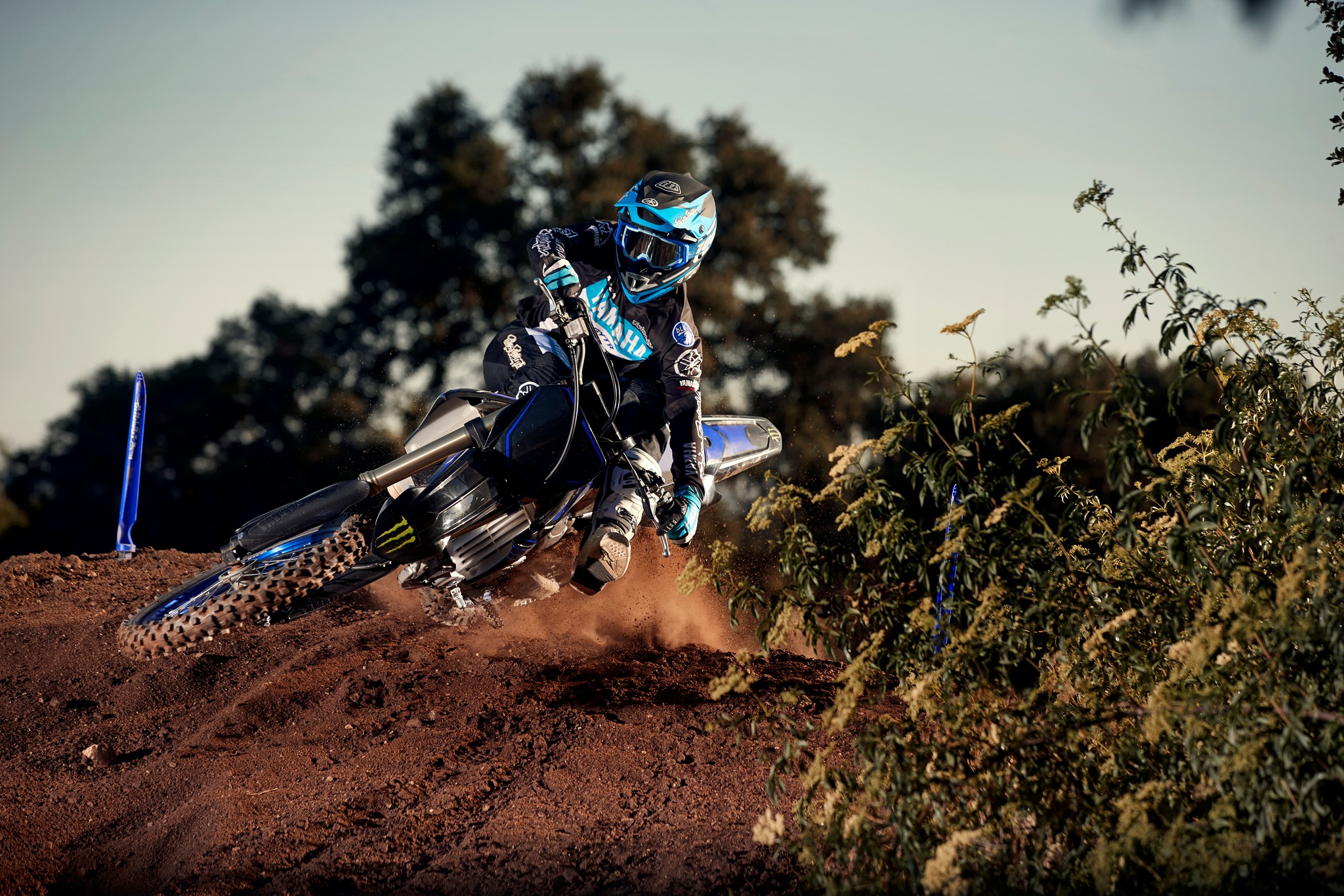 The YZ250F boasts top-spec details including 1-1/8” aluminum tapered handlebars, wide 55mm foot pegs, a quick-adjust clutch perch, stylish blue rims and gold chain.