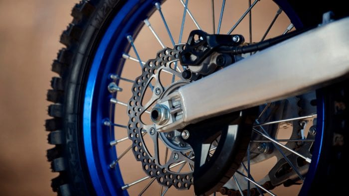 Braking is through a 270mm floating wave disc up front, clamped by a 2-piston competition caliper, and a 240mm wave disc out back with a single-piston competition caliper. The front wheel is 21 inches in diameter, with the rear at 19 inches. Ground clearance is at 13 inches (330 mm).