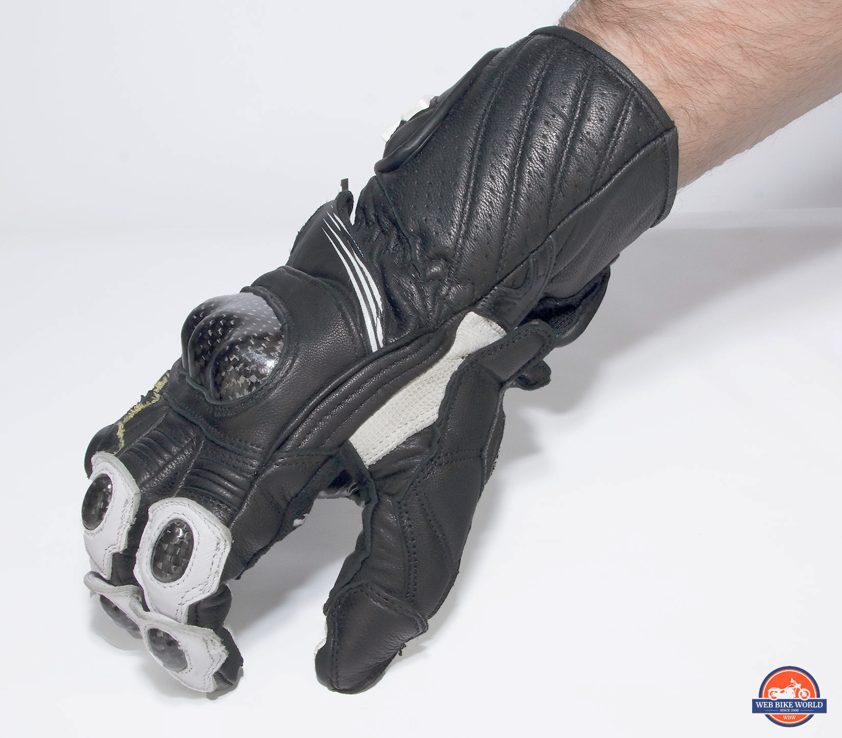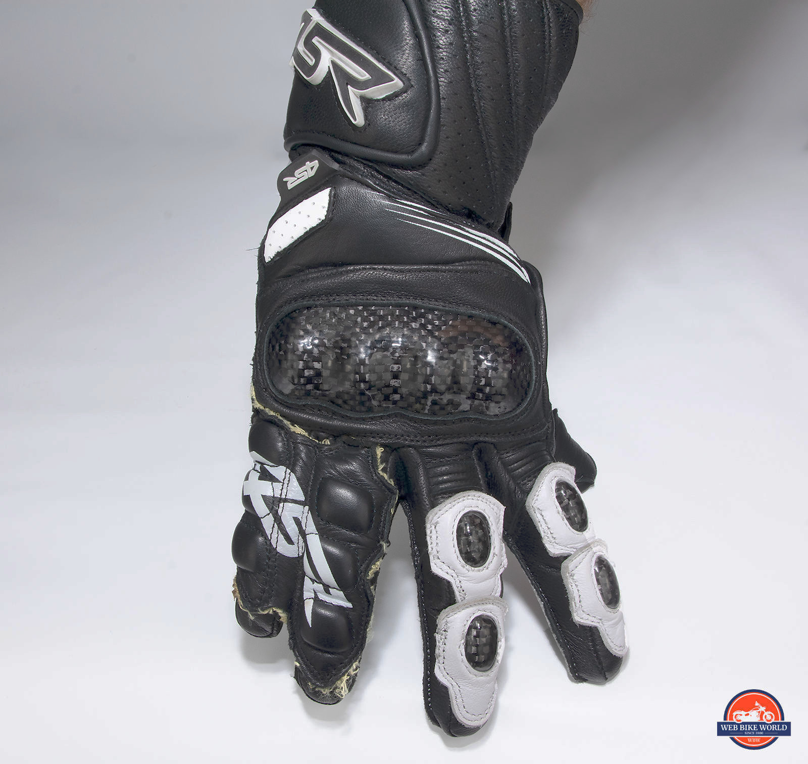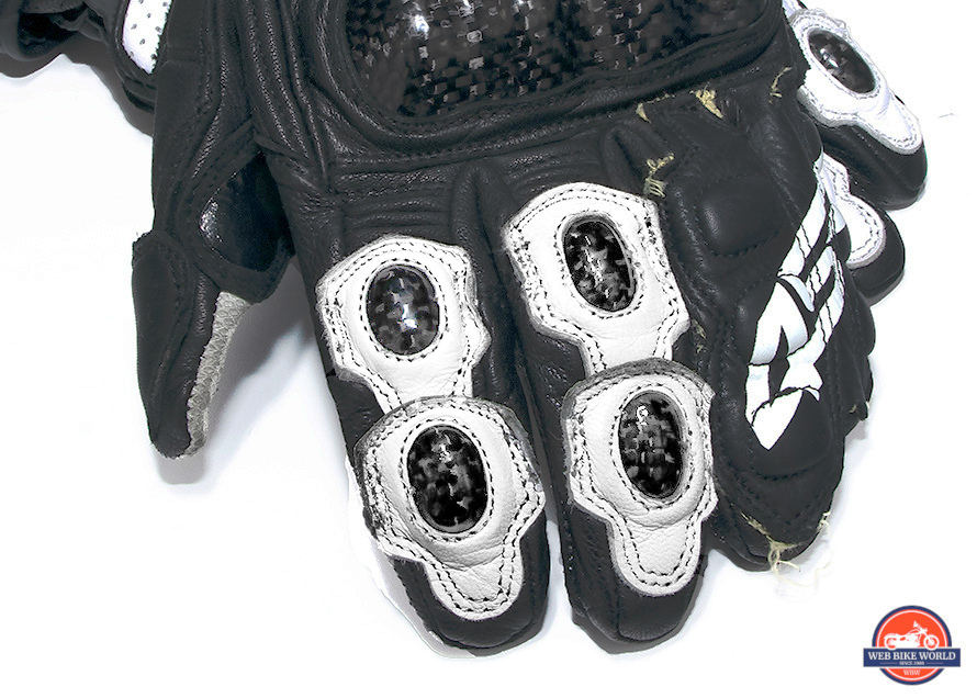 The knuckle area has hard resin-covered carbon fiber armor along with peanut sized caps over the finger joints of the first and second digits. I love the look of these purely white on black gloves, but adding in the carbon fiber makes good seem even better.