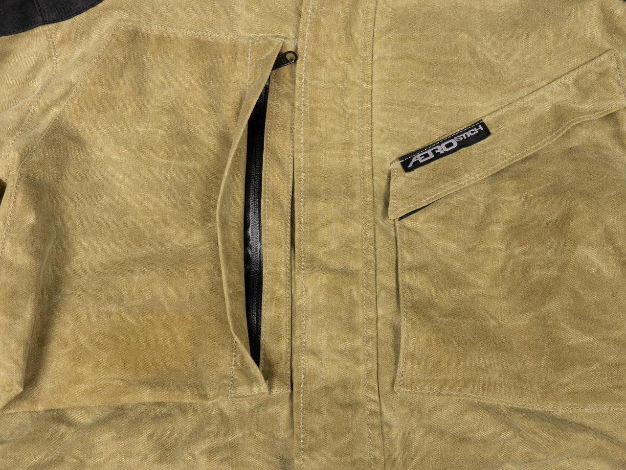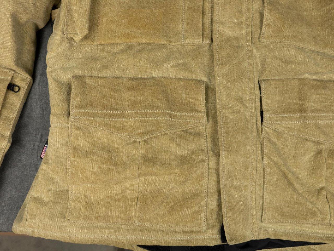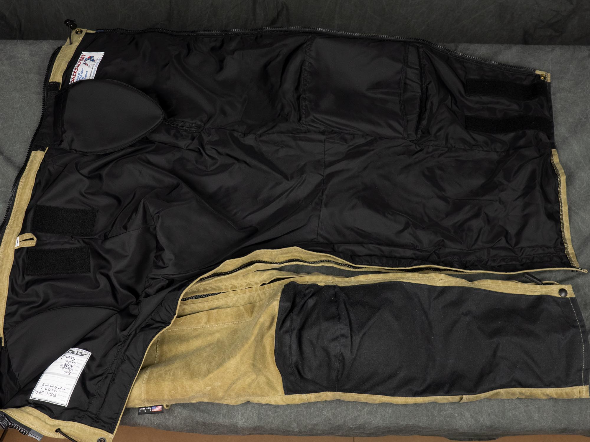 Heavy. If I had only one word to describe the jacket and pants heavy would be it. The shell is made from a 10 oz waxed cotton fabric with double layers (visible in black) in the impact areas such as the seat, shoulders, and elbows. The stitching appears single stitched for most areas but there are some double stitched areas on the pants. The work on the seams here is very neatly done and very strong from what I can discern.