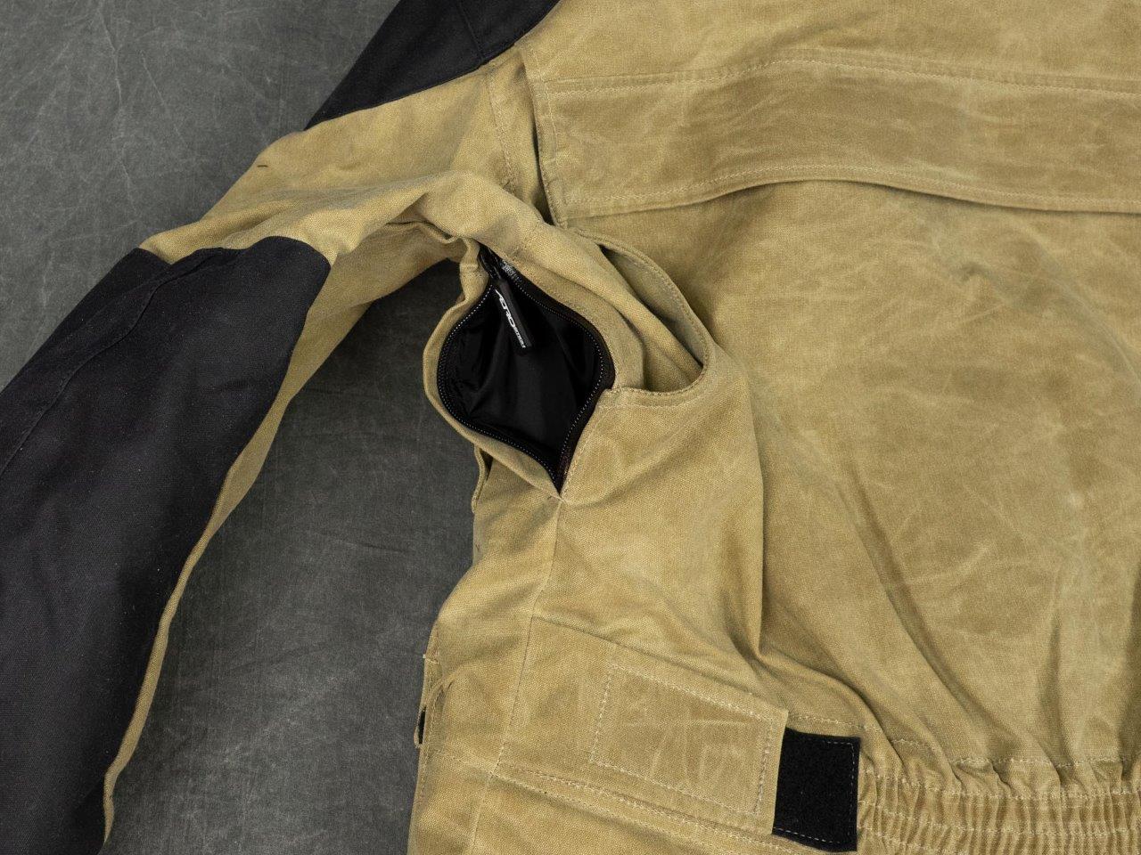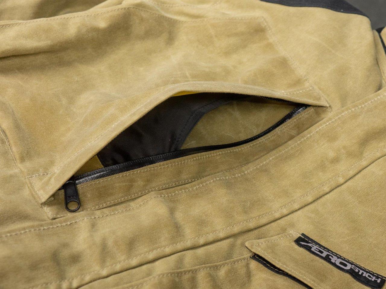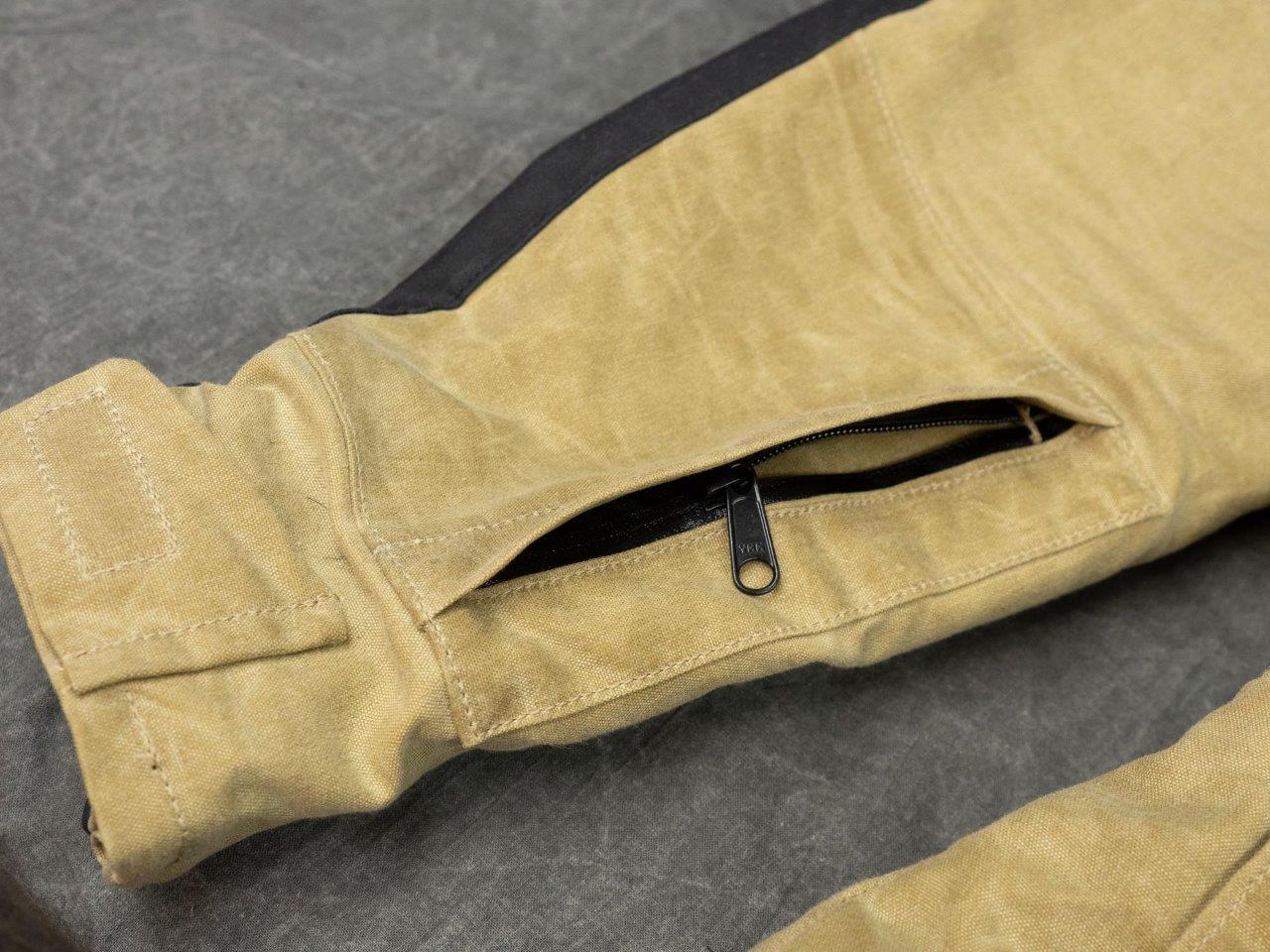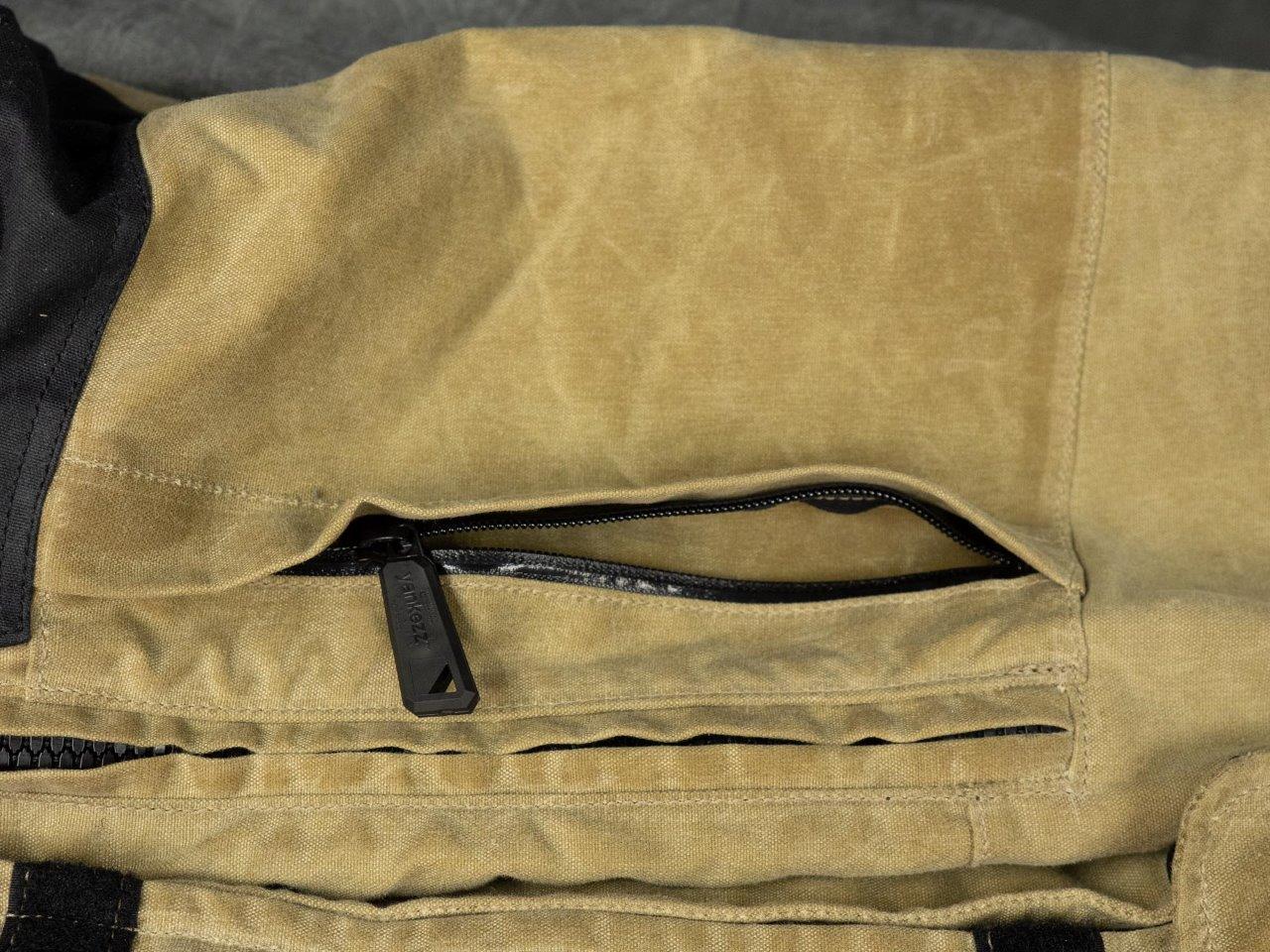 Finally, there is an interior pocket in the left side just under the Aerostich label that would be a good place to store a wallet or mobile device in case of inclement weather. For easier access to small items, there is a pocket on the right forearm. This pocket should easily hold smaller items like a mobile phone, wallet, or keys easily and it has a waterproof zip for closure.