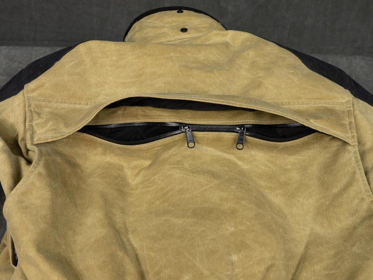 Up between the shoulder blades is a wide vent with a waterproof zipper. Two zippers are used for airflow adjustment. Behind the vent is a large mesh section that opens to the interior between the shell and liner. This prevents some air from moving through but it should provide enough to reduce “ballooning” when the front is open.