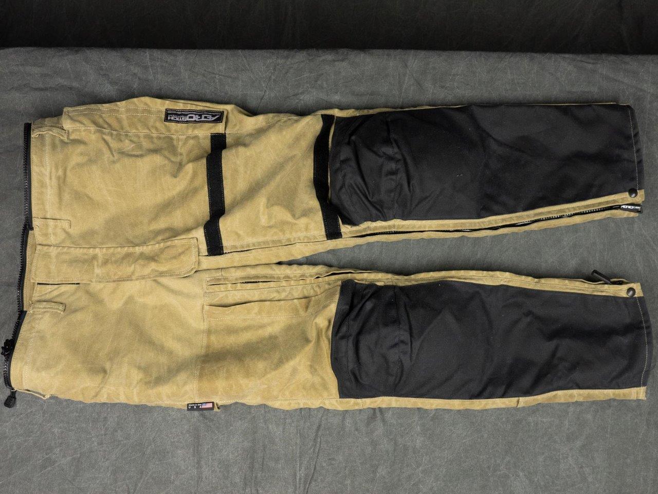 The pants are constructed of the same 10 oz waxed cotton as the jacket with double layers in the seat and knees with the knees and shin outer layer being black, while the seat is the same brown color as the rest of the shell.